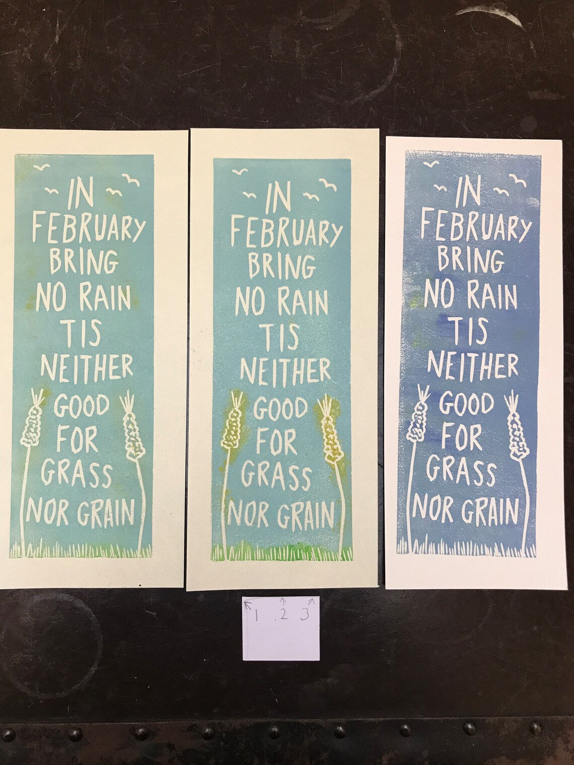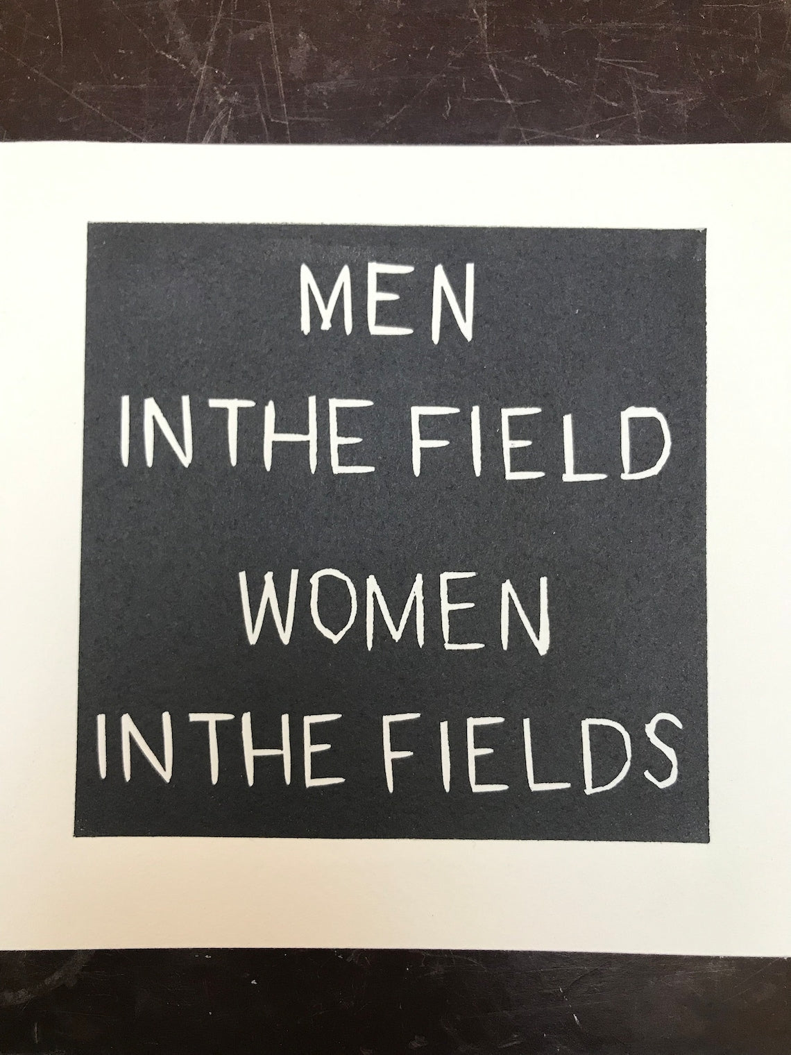 - From a residency I was part of at Murton Museum of Farming near York - Quote from a farming diary linocut 9x3cm - multicolour on thin yellow paper (slight rip in top corner) - ‘Men in the fields’ inspired by a wartime banner linocut