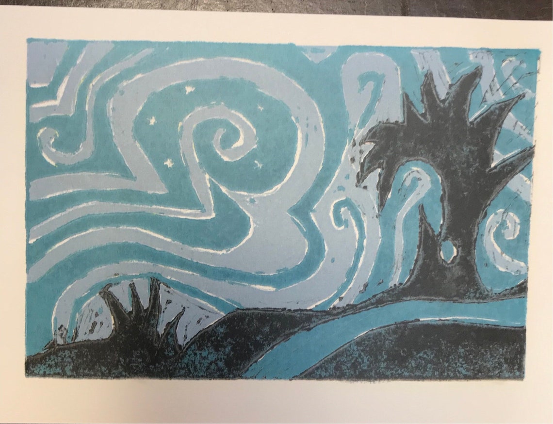 - Night sky reduction linocut (Print, not an original) 6x4”