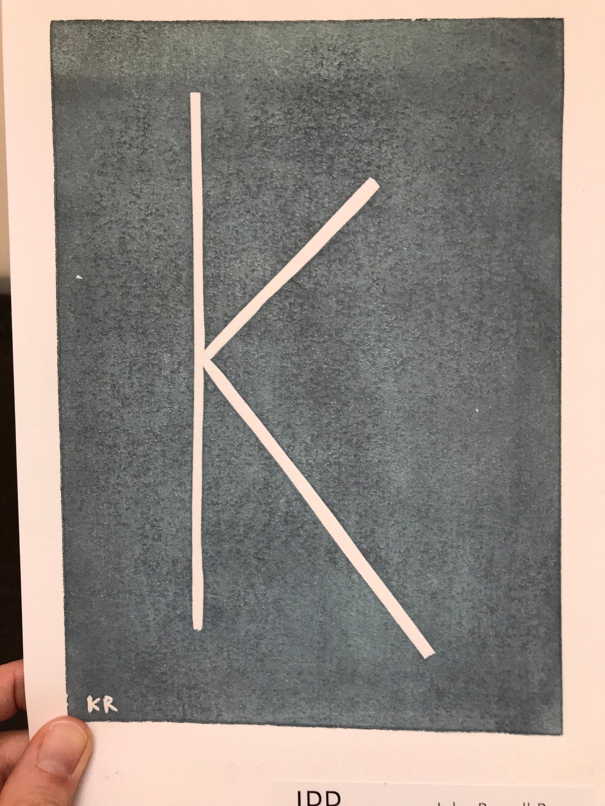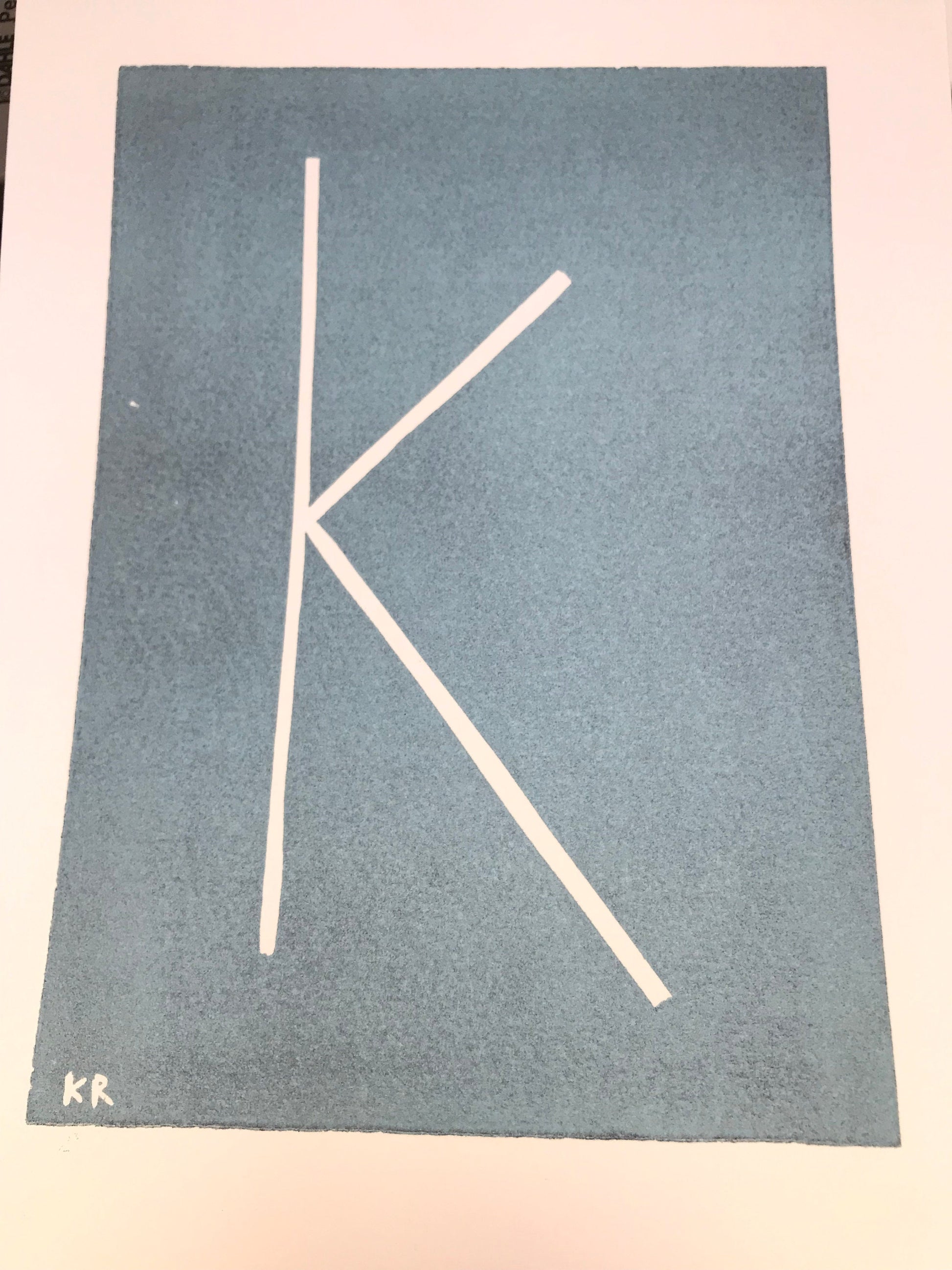 - K linocut in pale blue 8.5x6” (tests on thick printmaking paper)