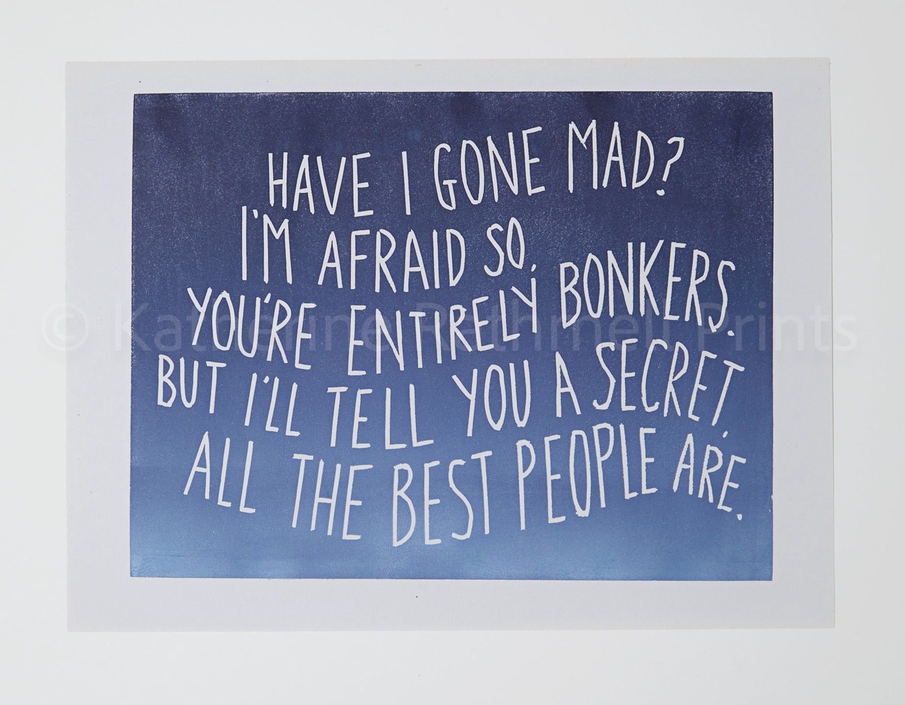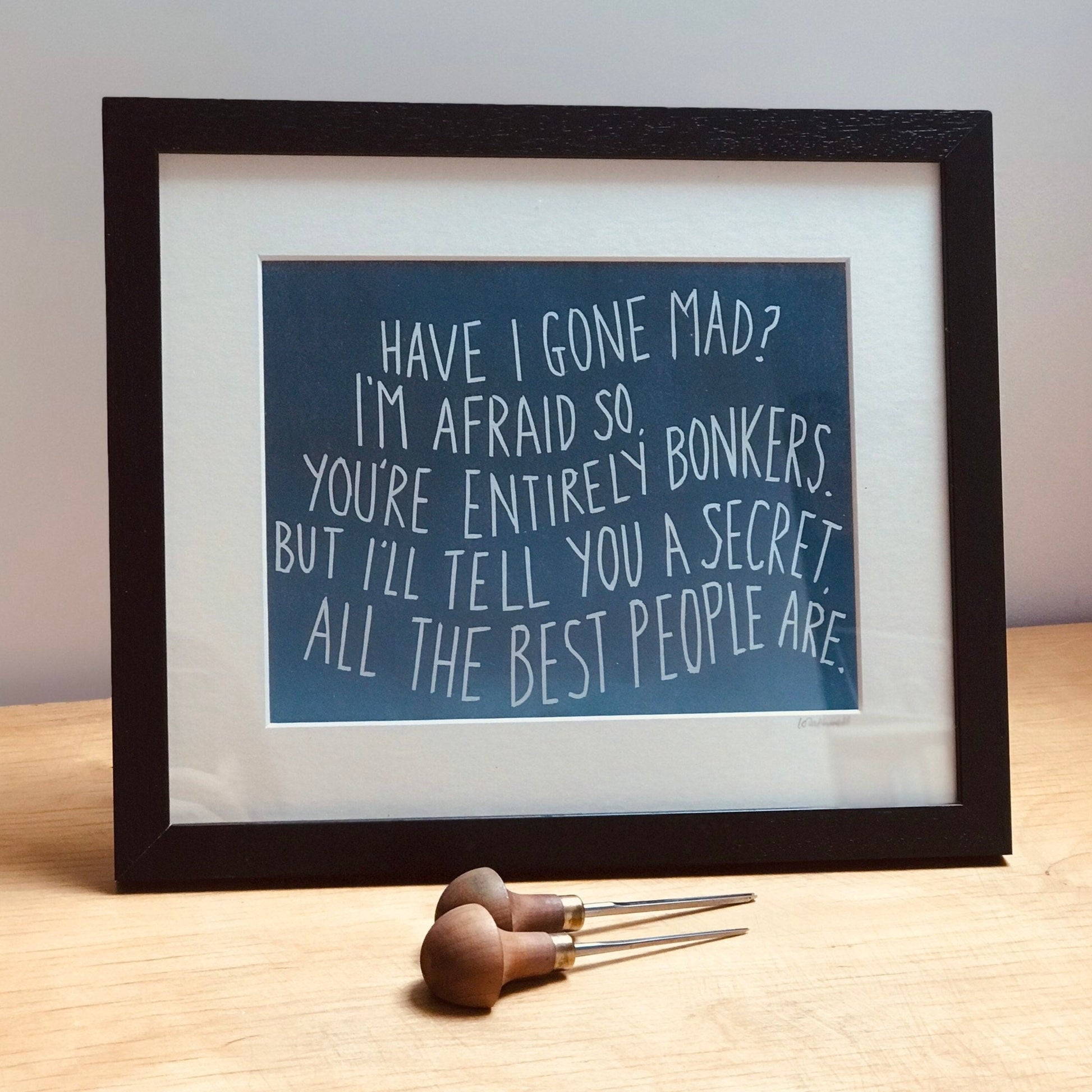 Alice in Wonderland 'Have I gone Mad' quote linocut print in blue or purple