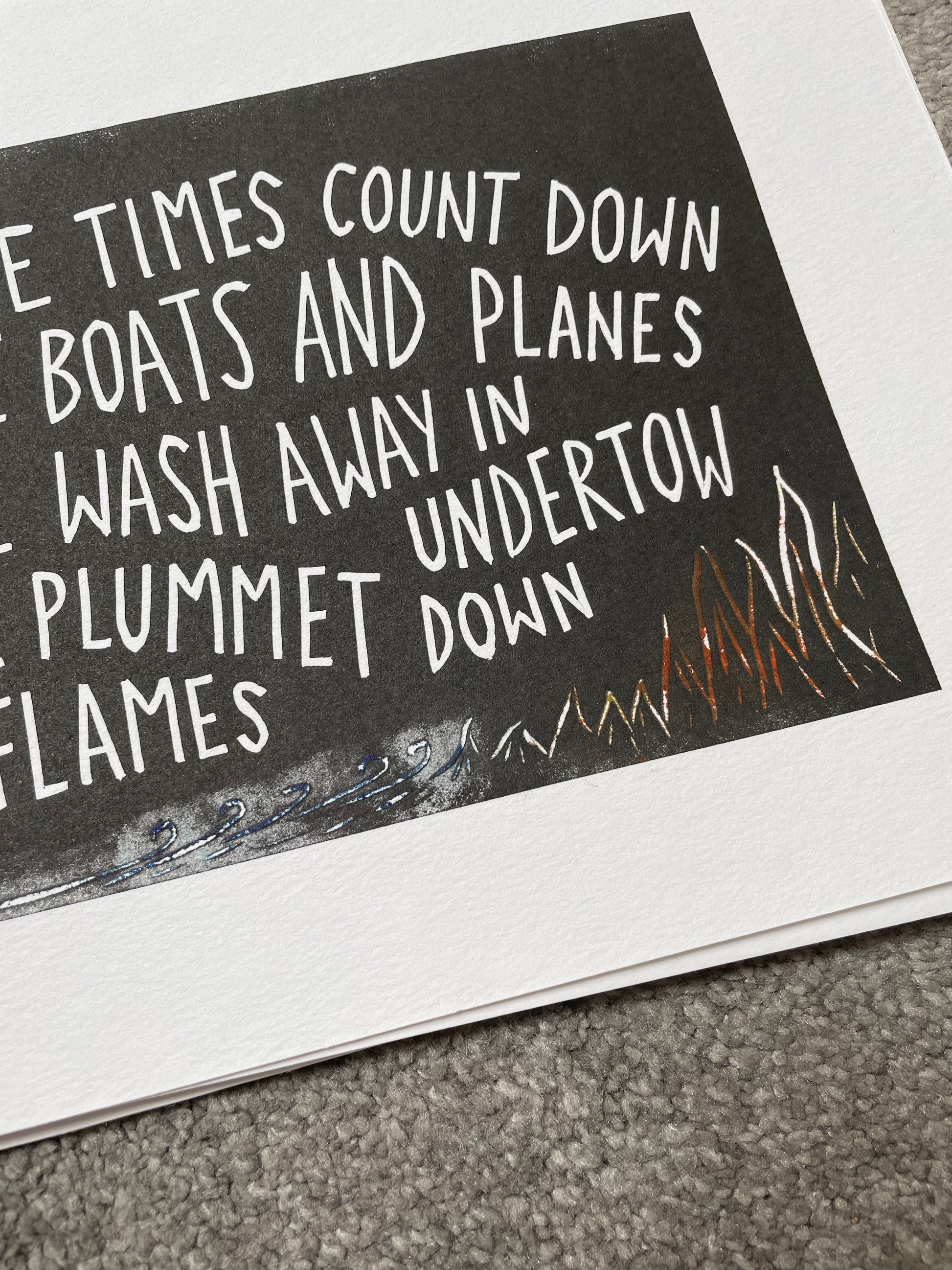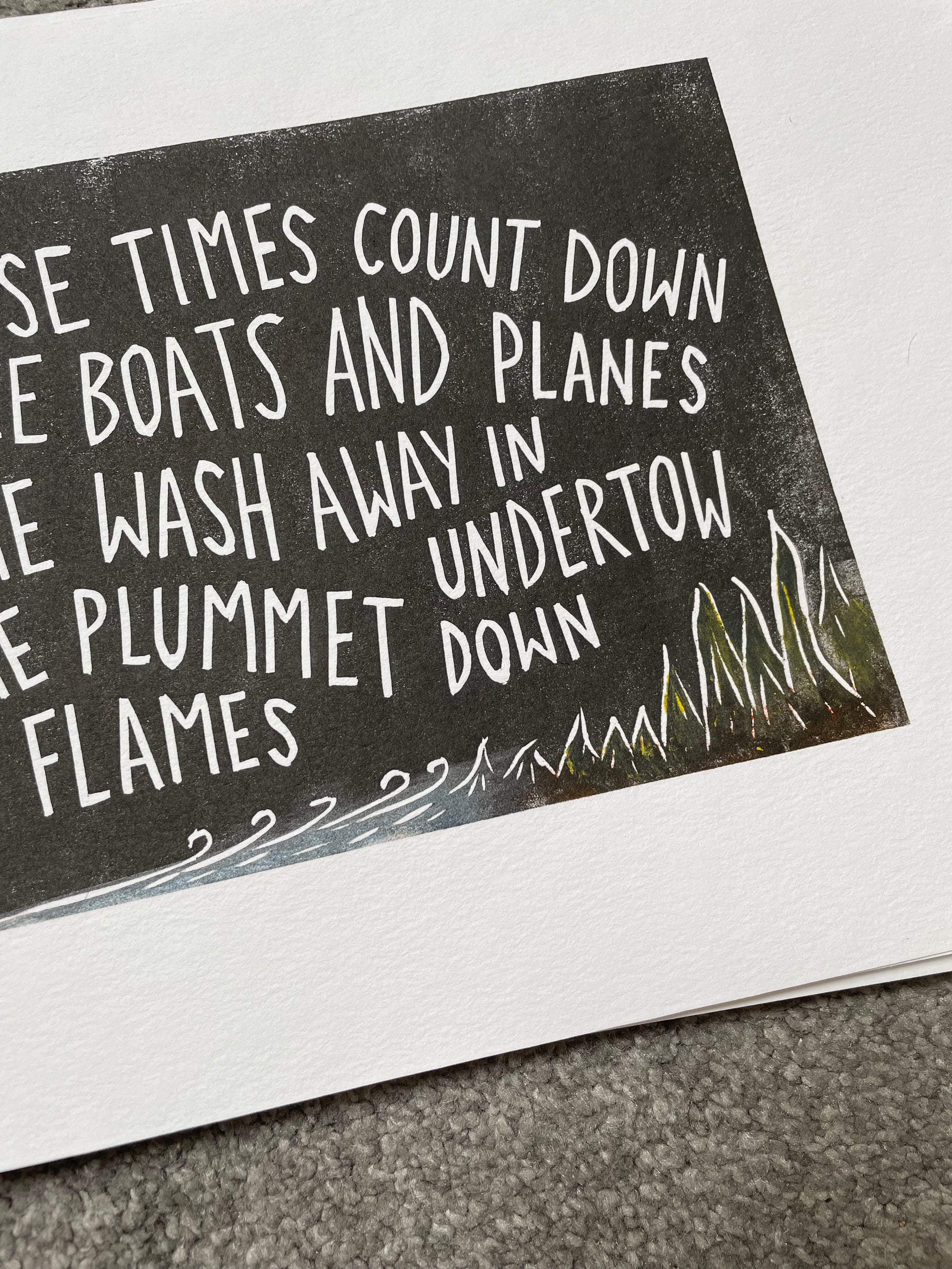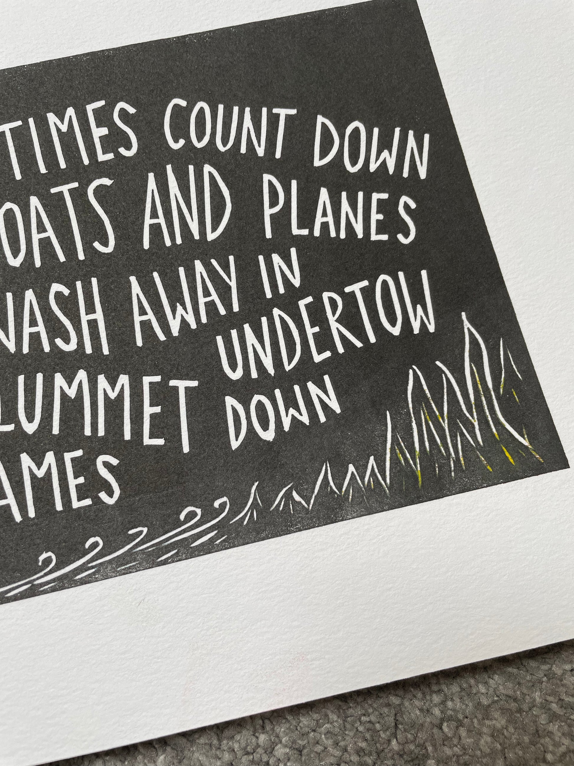 Original linocut print inspired by lyrics from band Alkaline Trio's song 'Trucks and Trains"