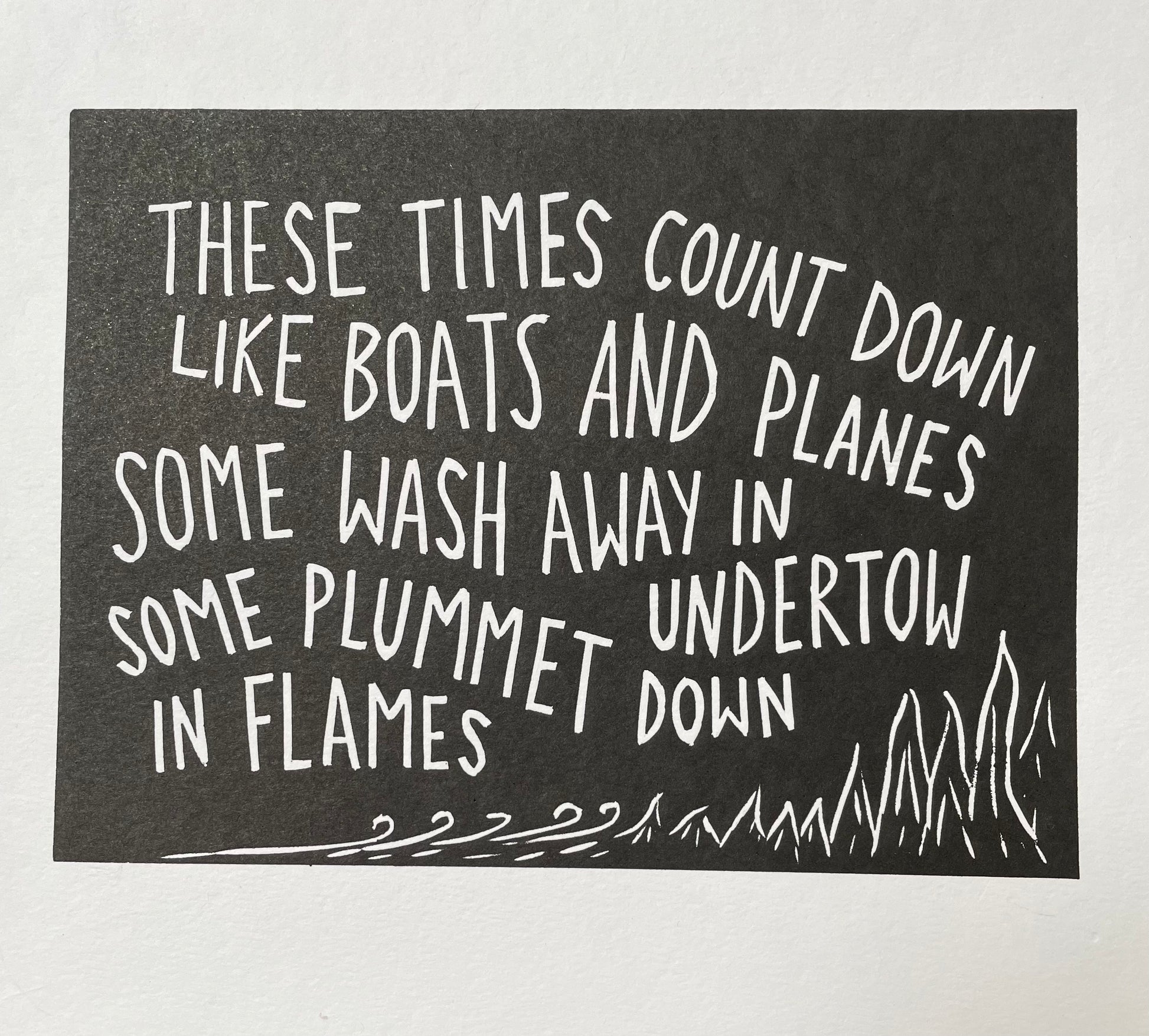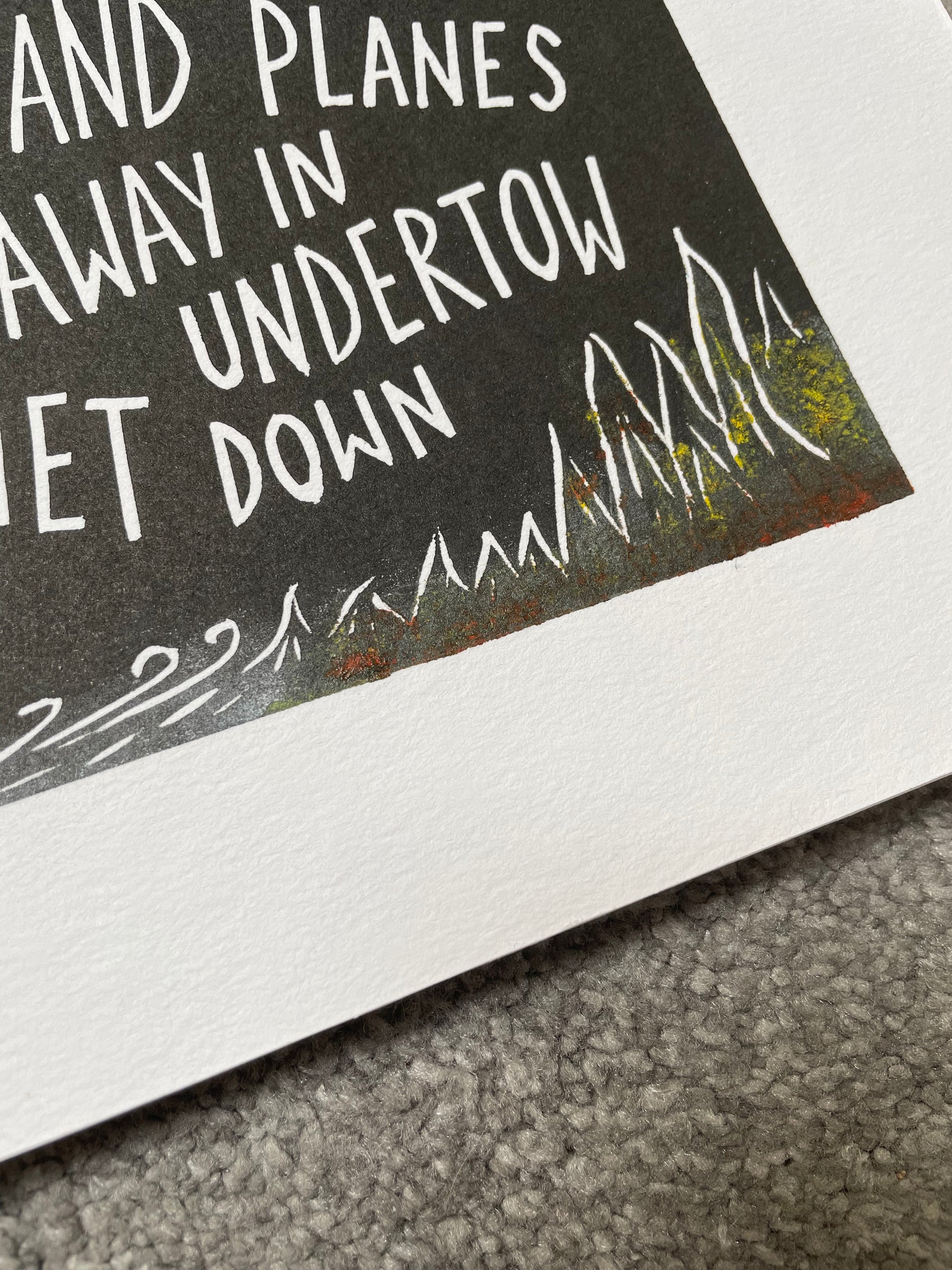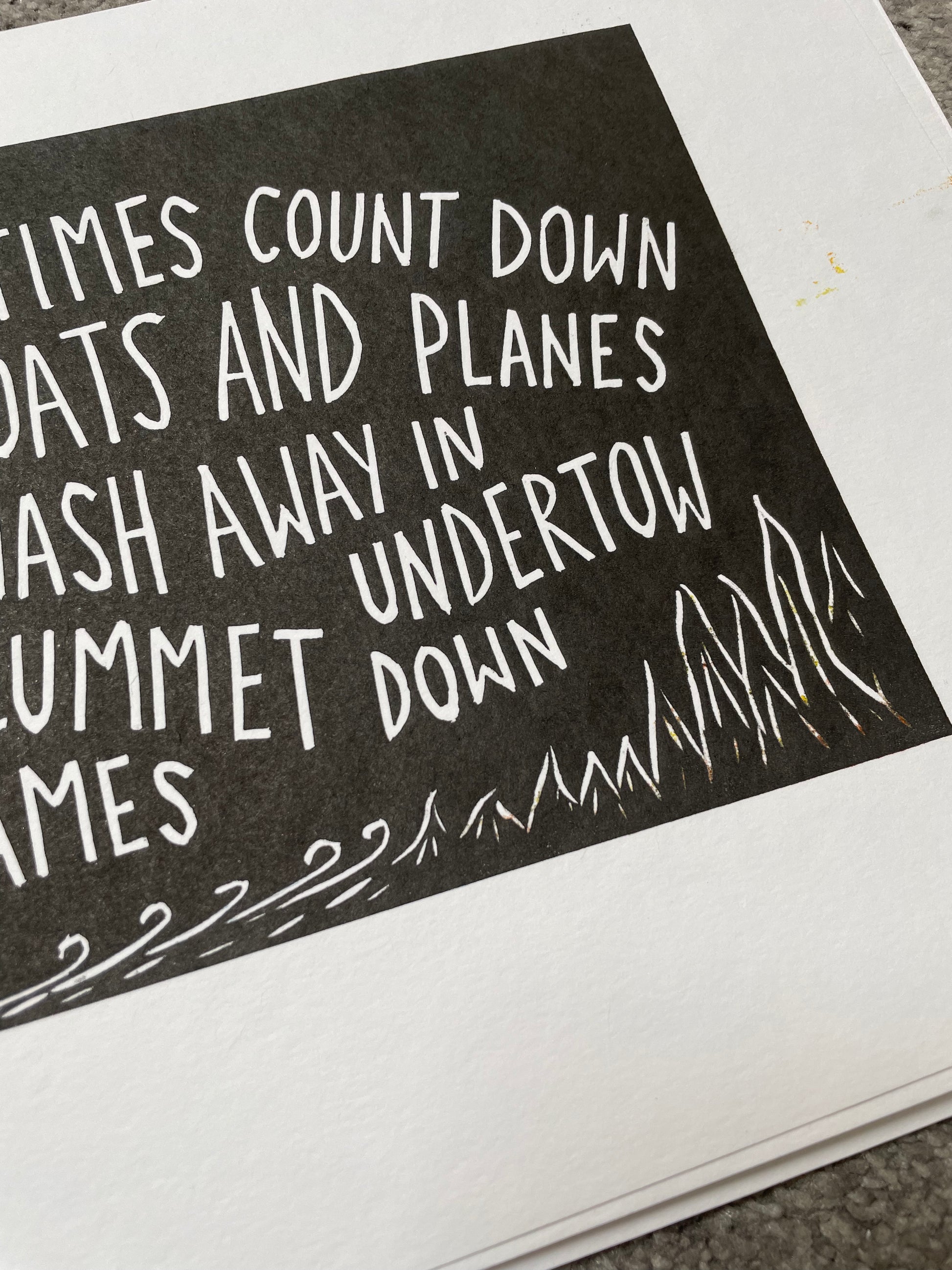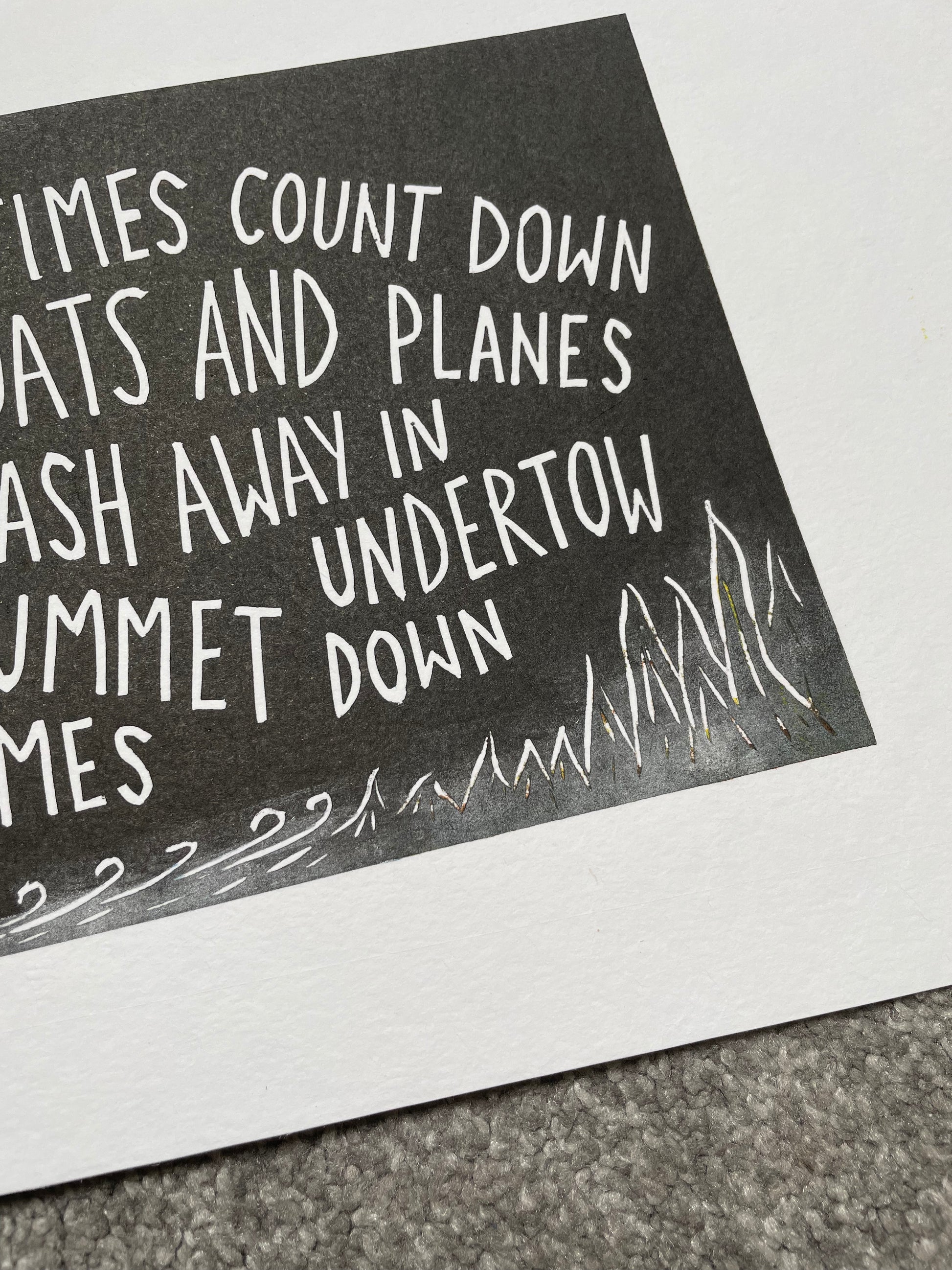 Original linocut print inspired by lyrics from band Alkaline Trio's song 'Trucks and Trains"