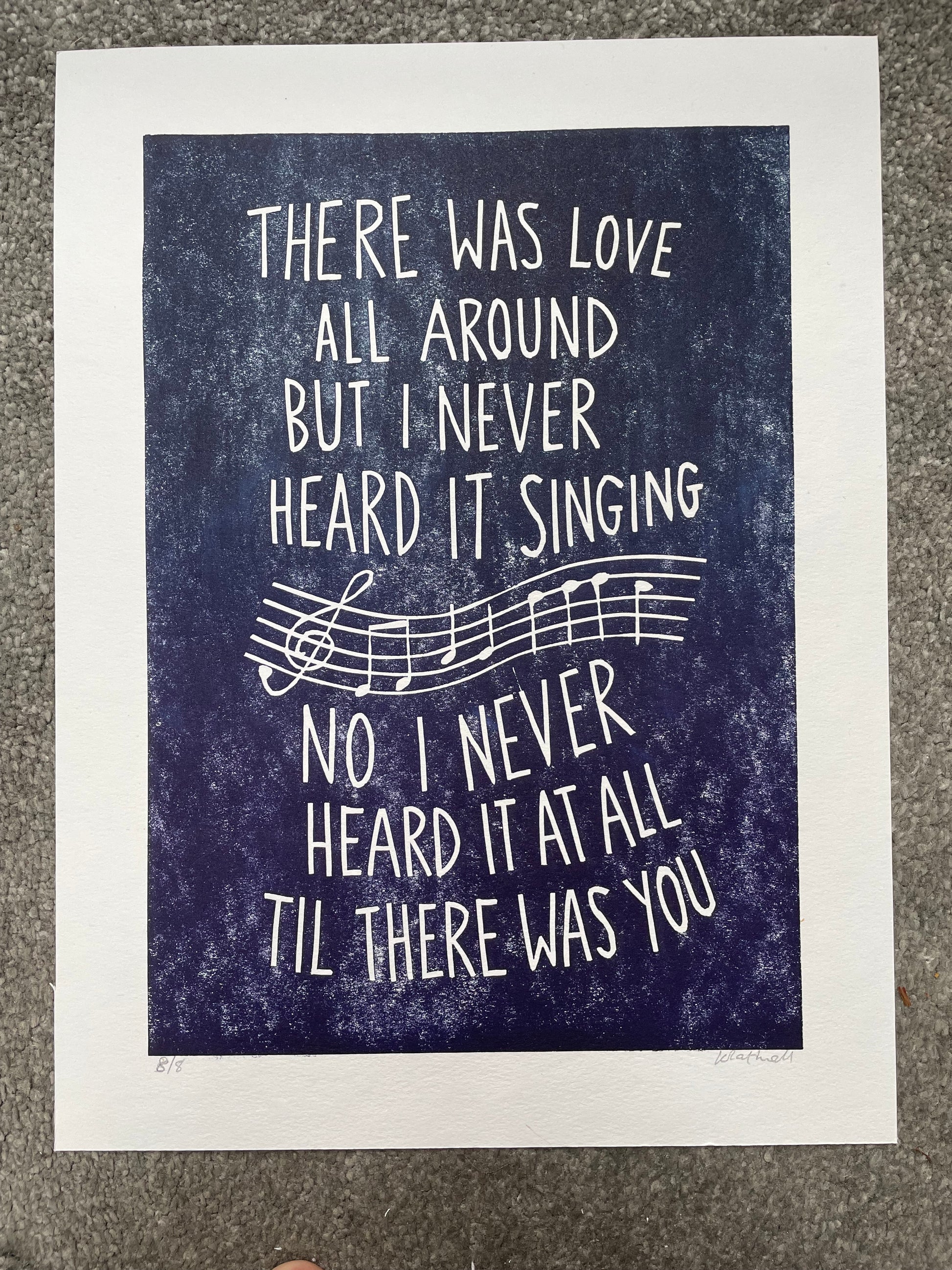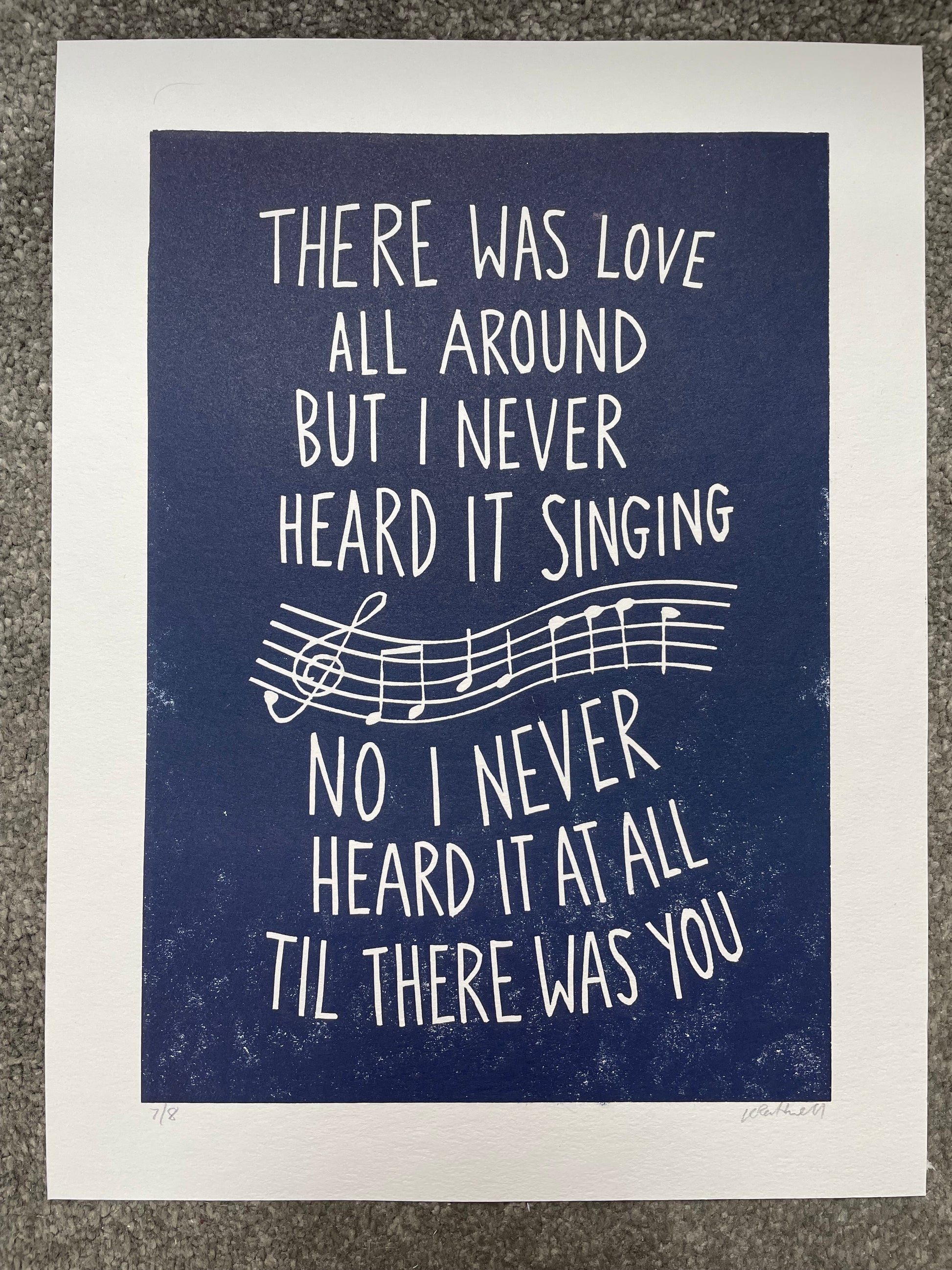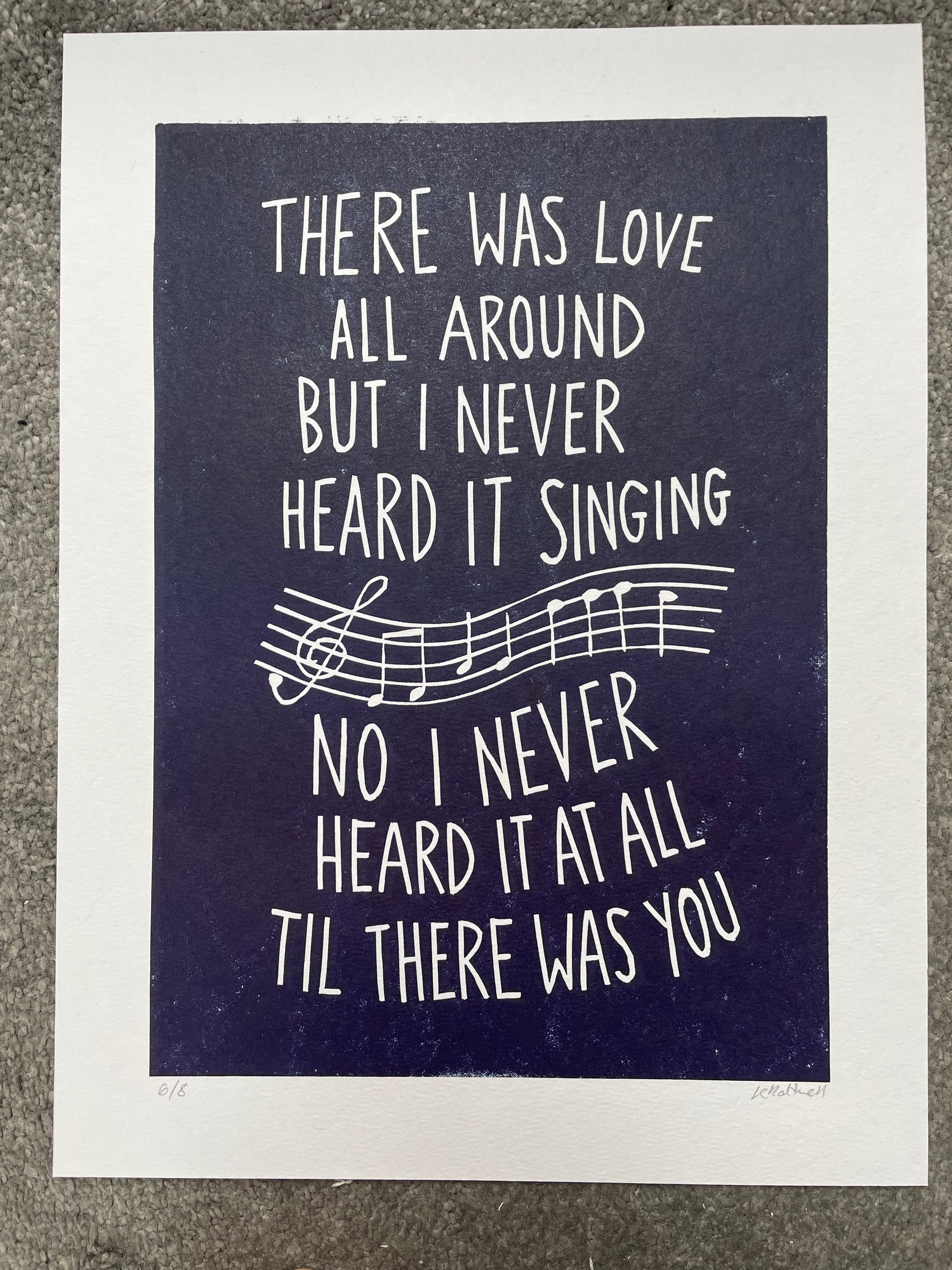 Hand cut and printed The Beatles ‘Til There Was You' song lyrics linocut in a deep blue and Prussian blue fade. This is an edition of 8 but they are all slightly different so I have listed them individually.