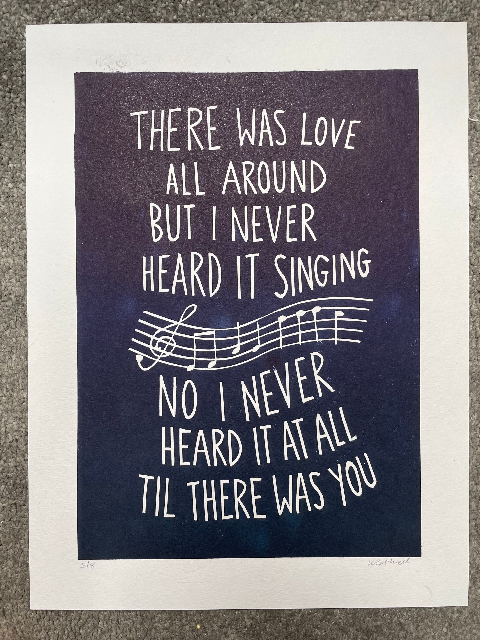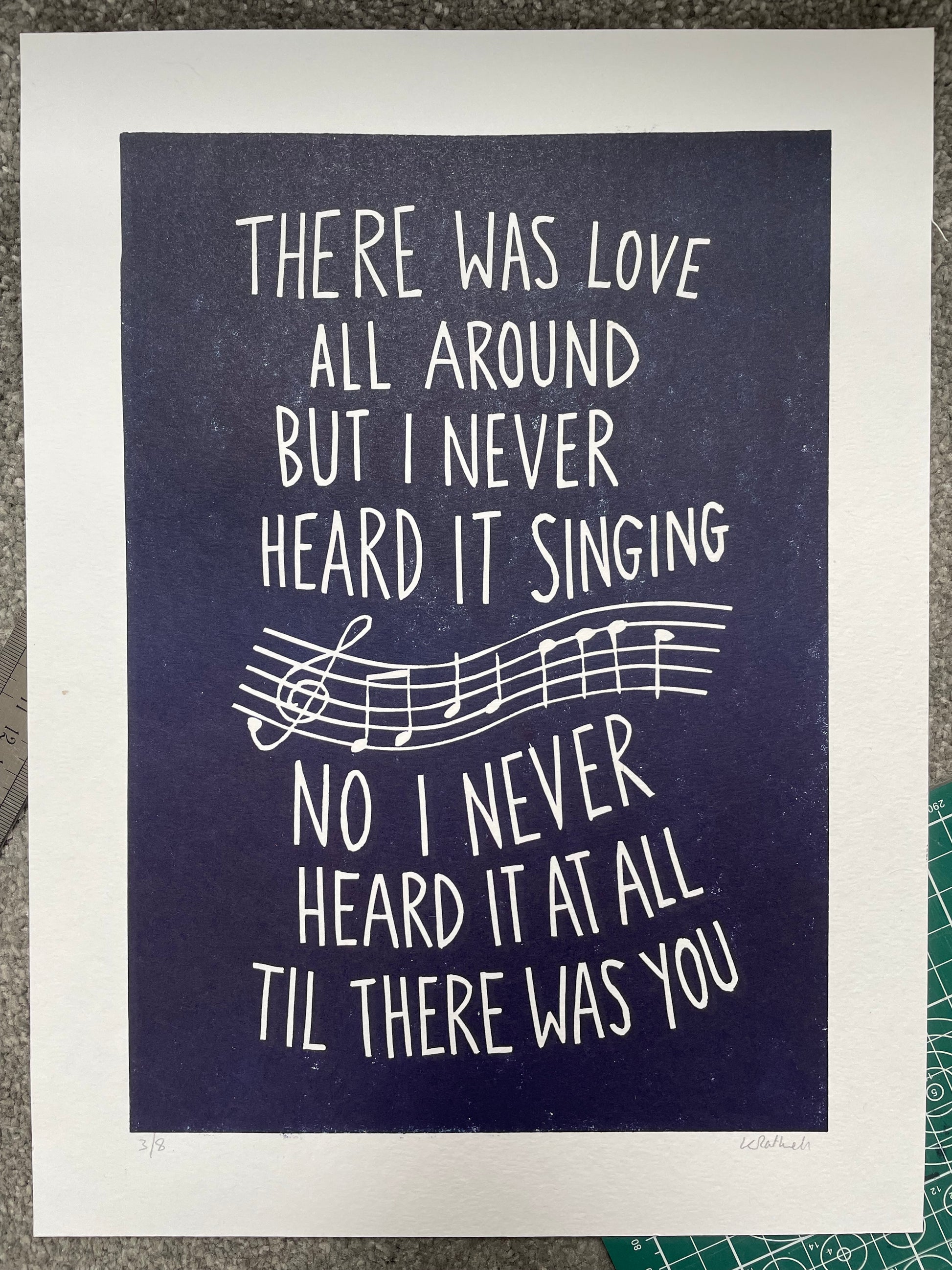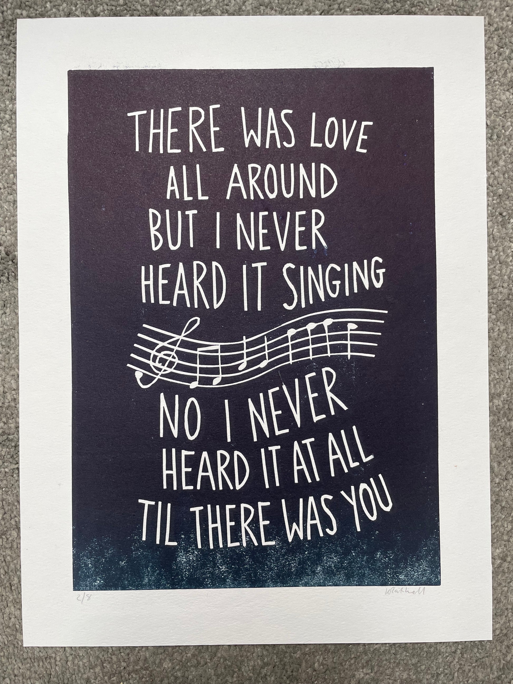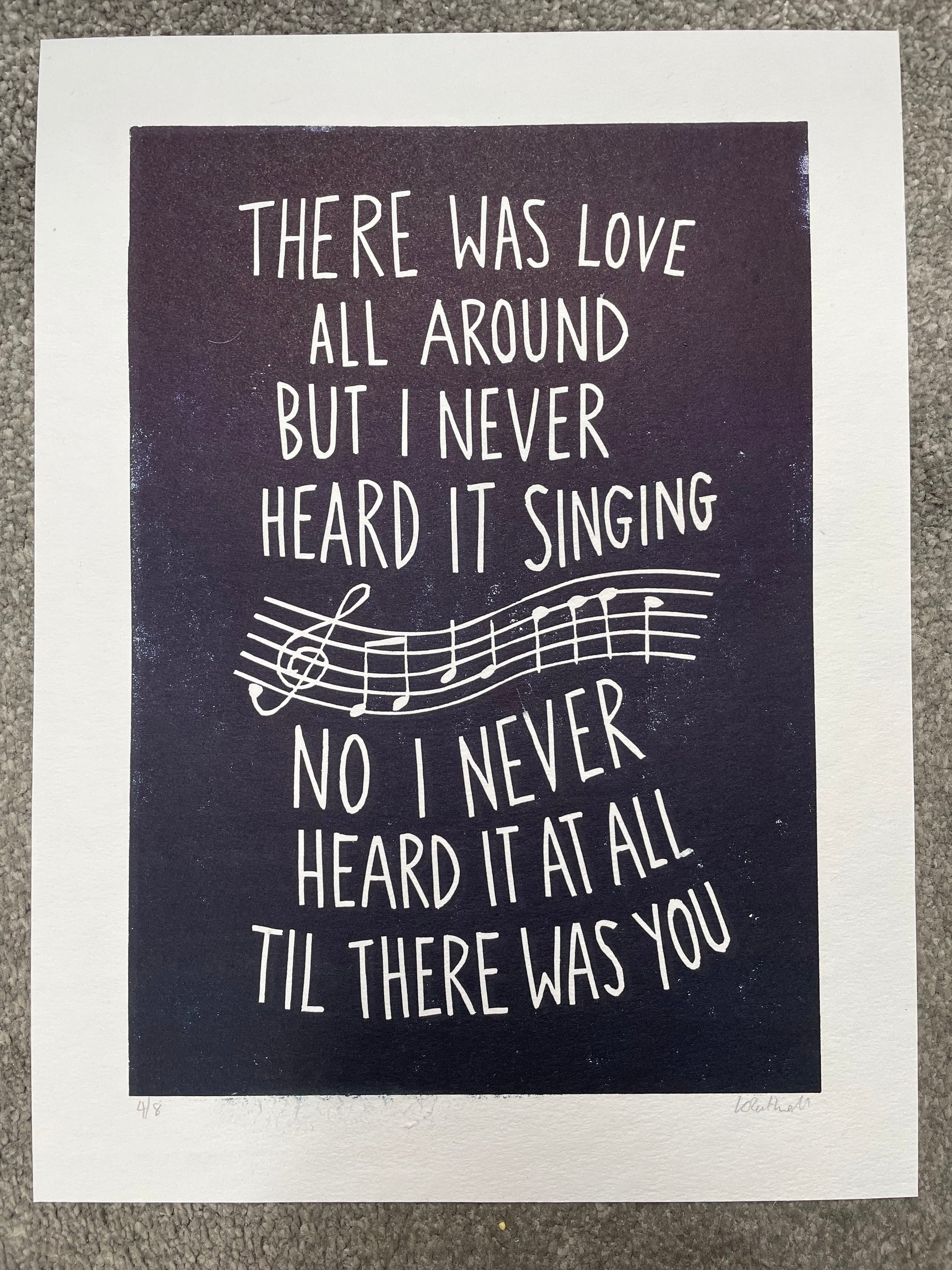 Hand cut and printed The Beatles ‘Til There Was You' song lyrics linocut in a deep blue and Prussian blue fade. This is an edition of 8 but they are all slightly different so I have listed them individually.