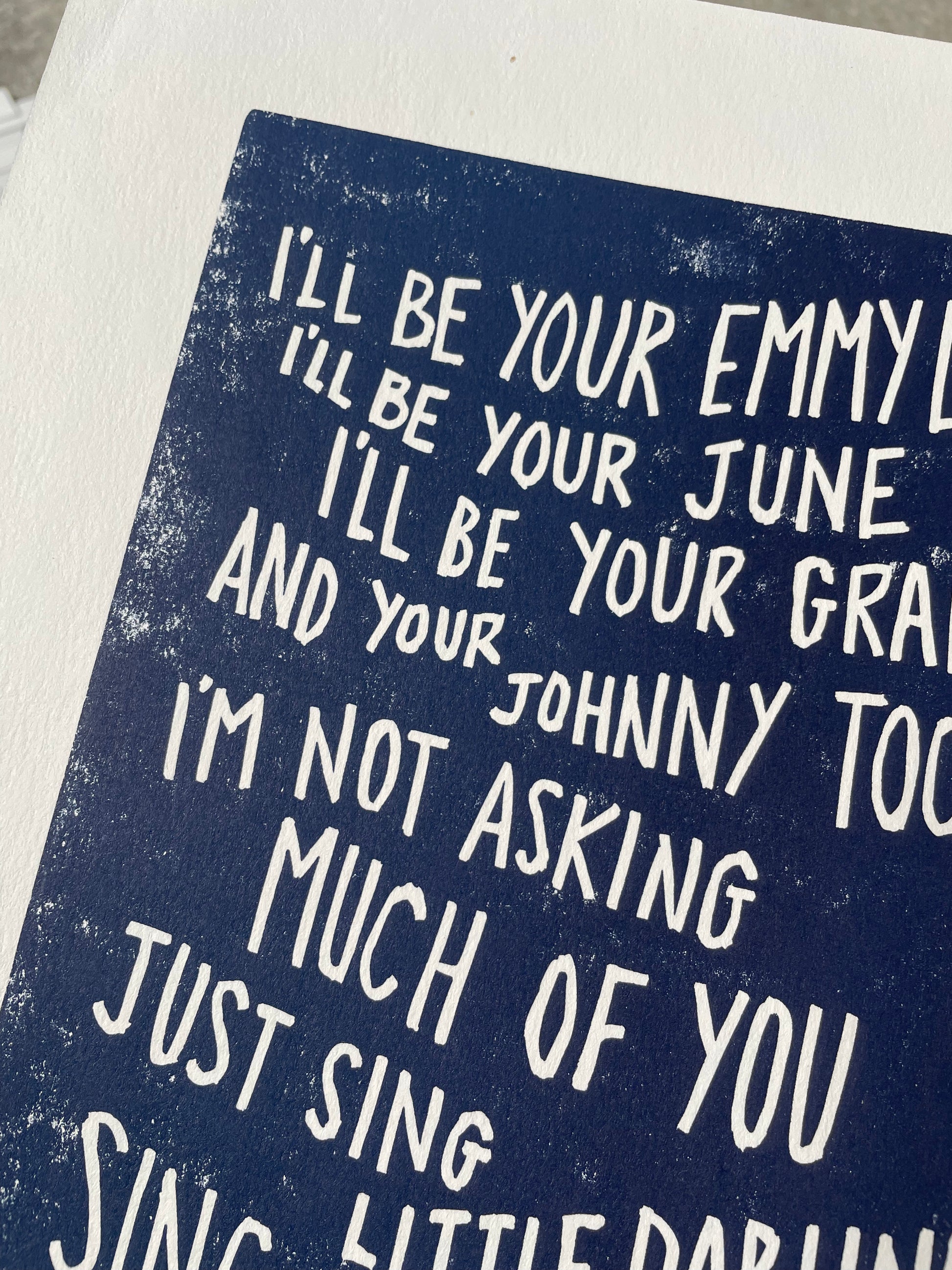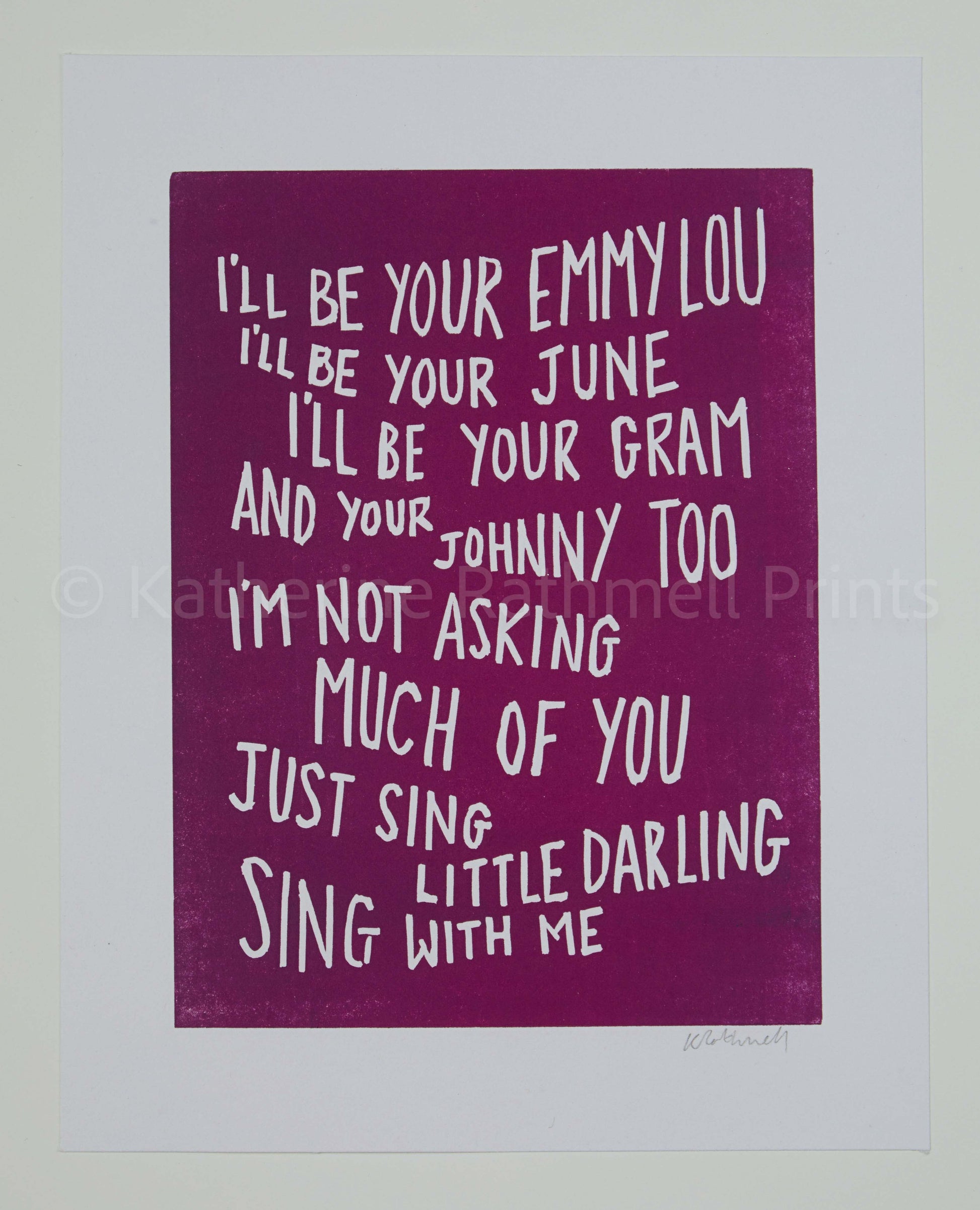 This is a hand pulled linocut of lyrics from First Aid Kit song ‘Emmylou’, one of my favourites!