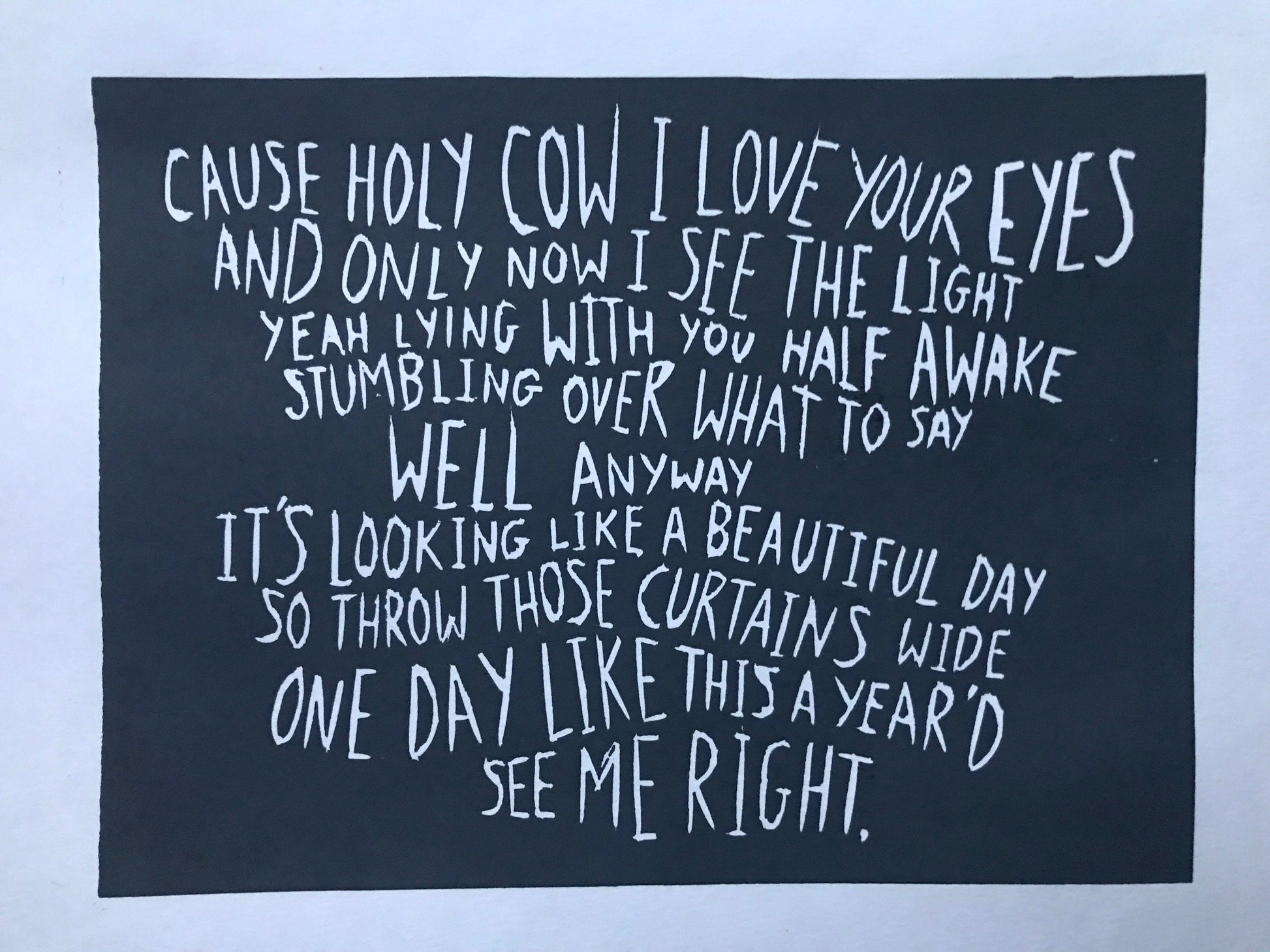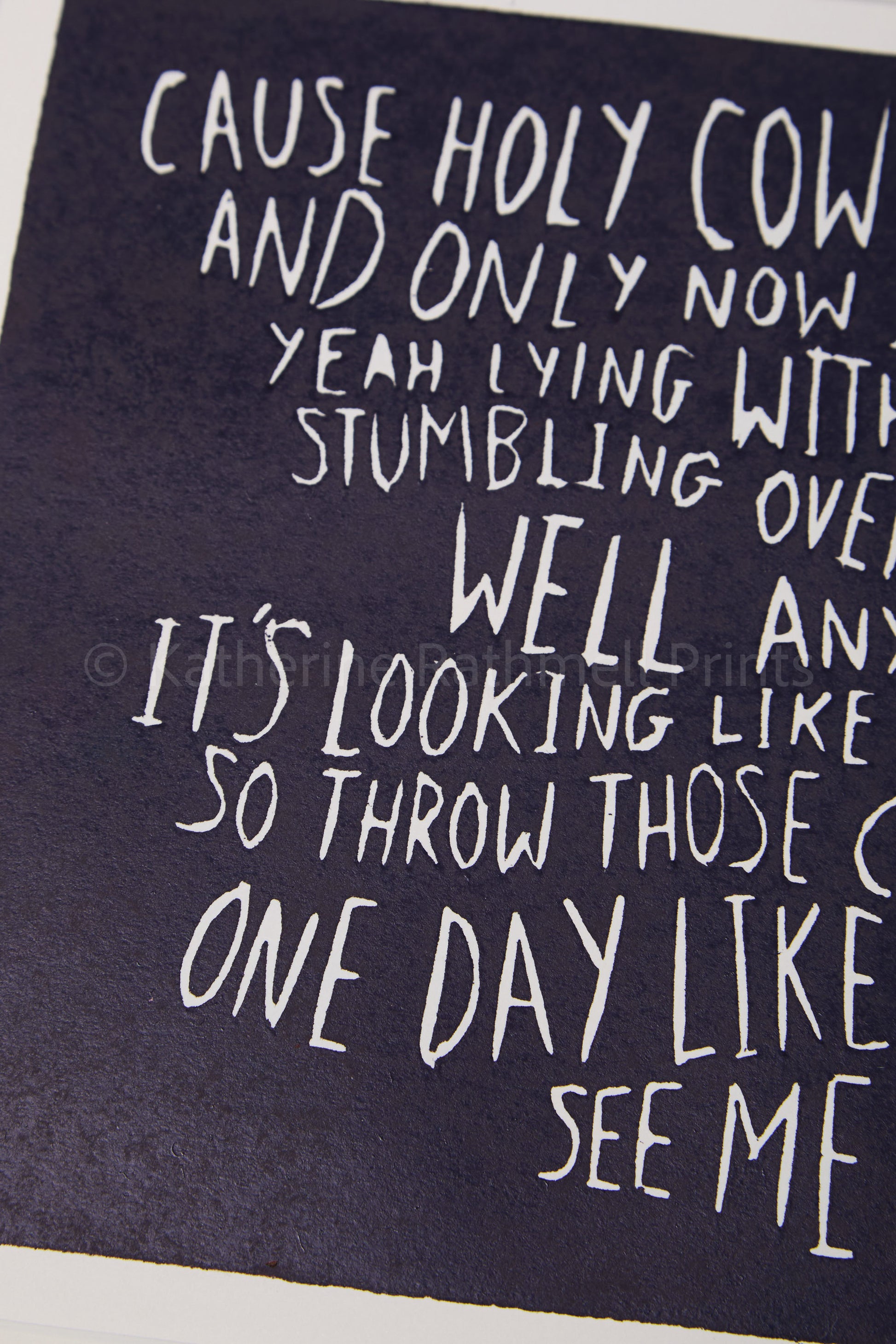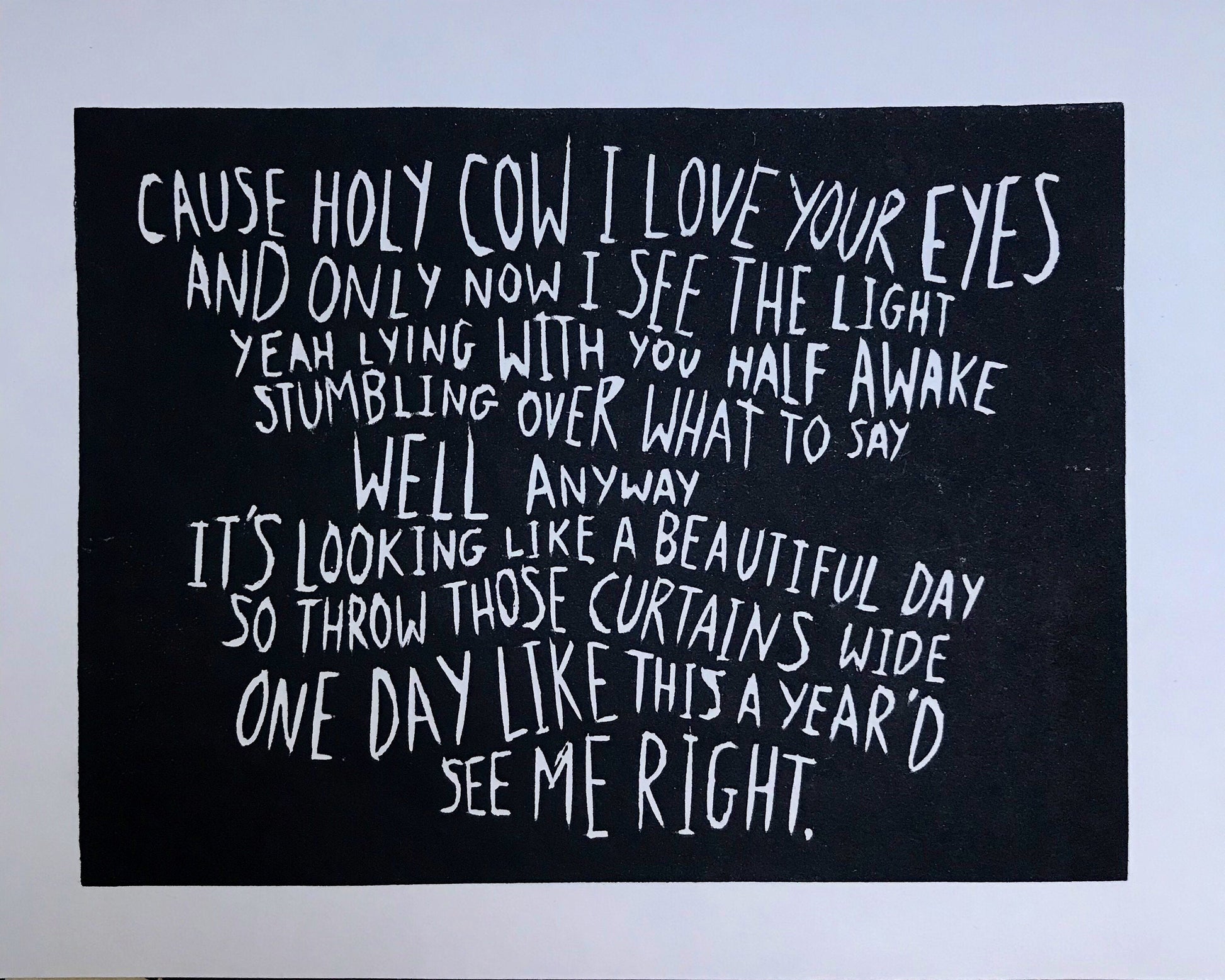 Black, deep purple, or dark grey linocut of the lyrics of Elbow's 'One Day Like This'.