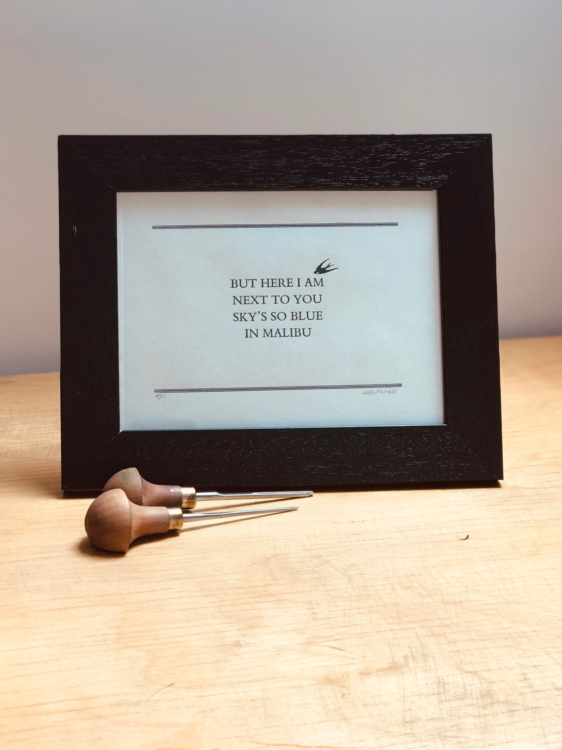 Miley Cyrus 'Malibu' lyrics inspired letterpress print