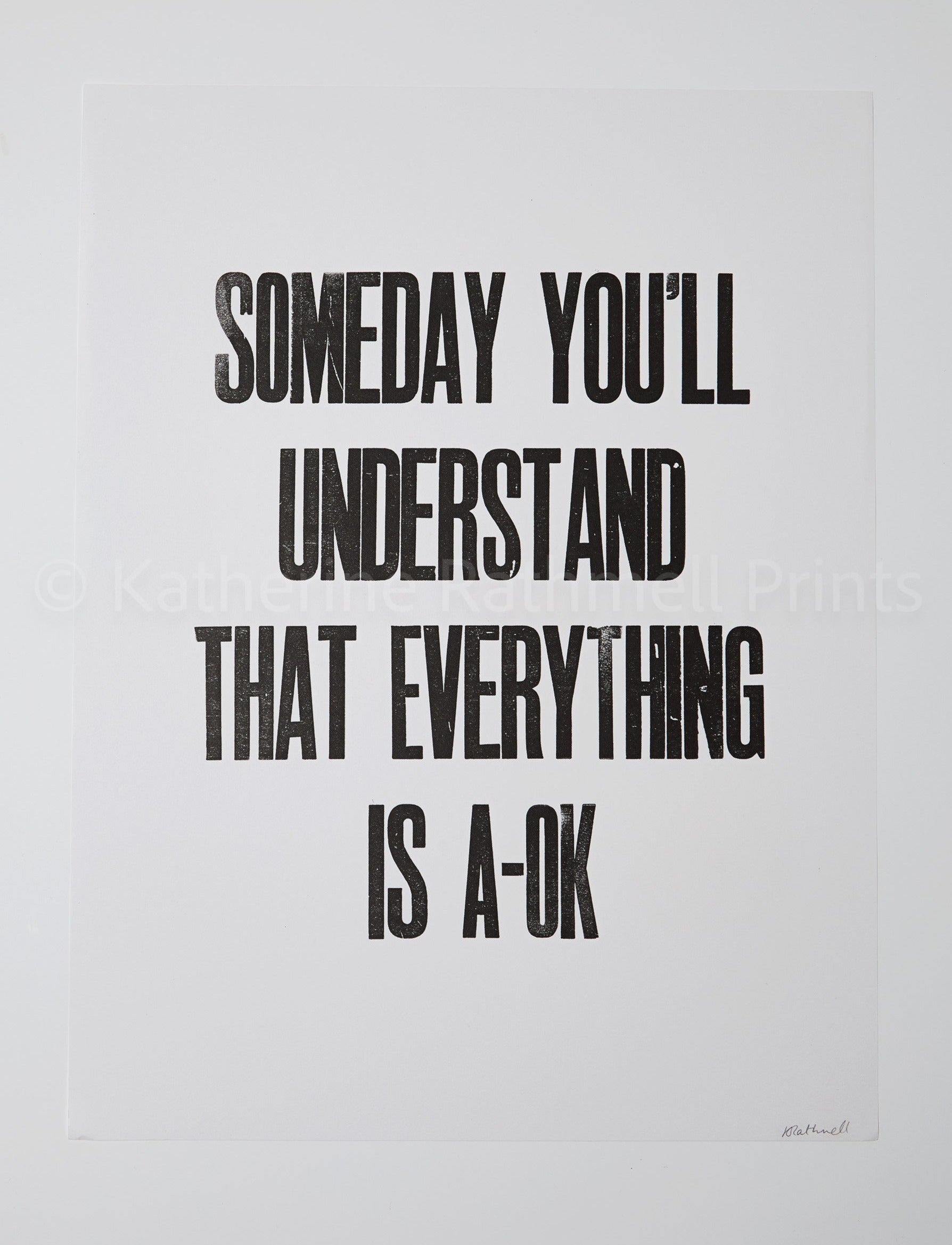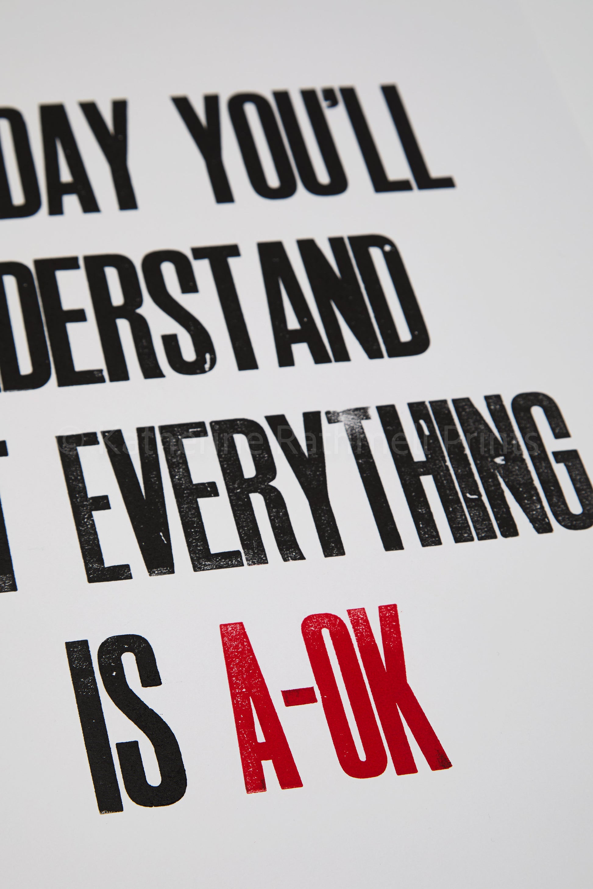 Hand pulled limited edition letterpress print of lyrics from #motioncitysoundtrack song 'A-ok'. Printed using an ancient Albion press and comes in two versions, one all black (edition of 5) the other with the 'A-ok' in red (edition of 5).
