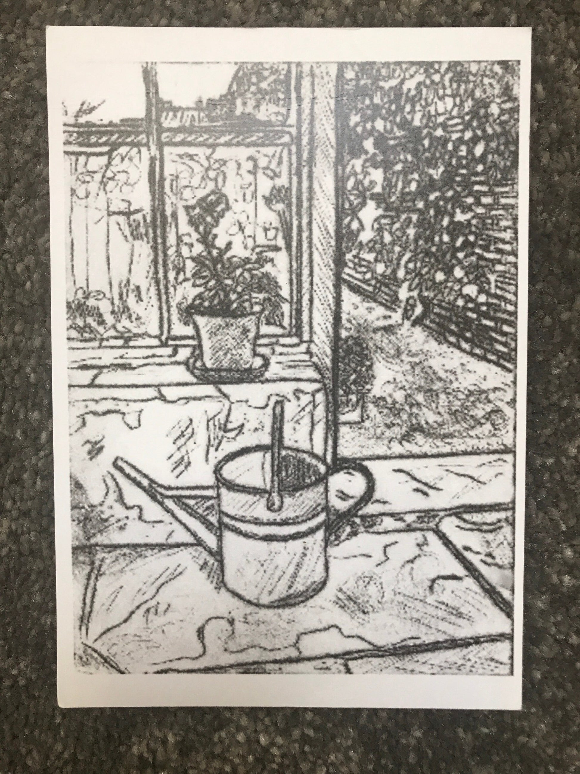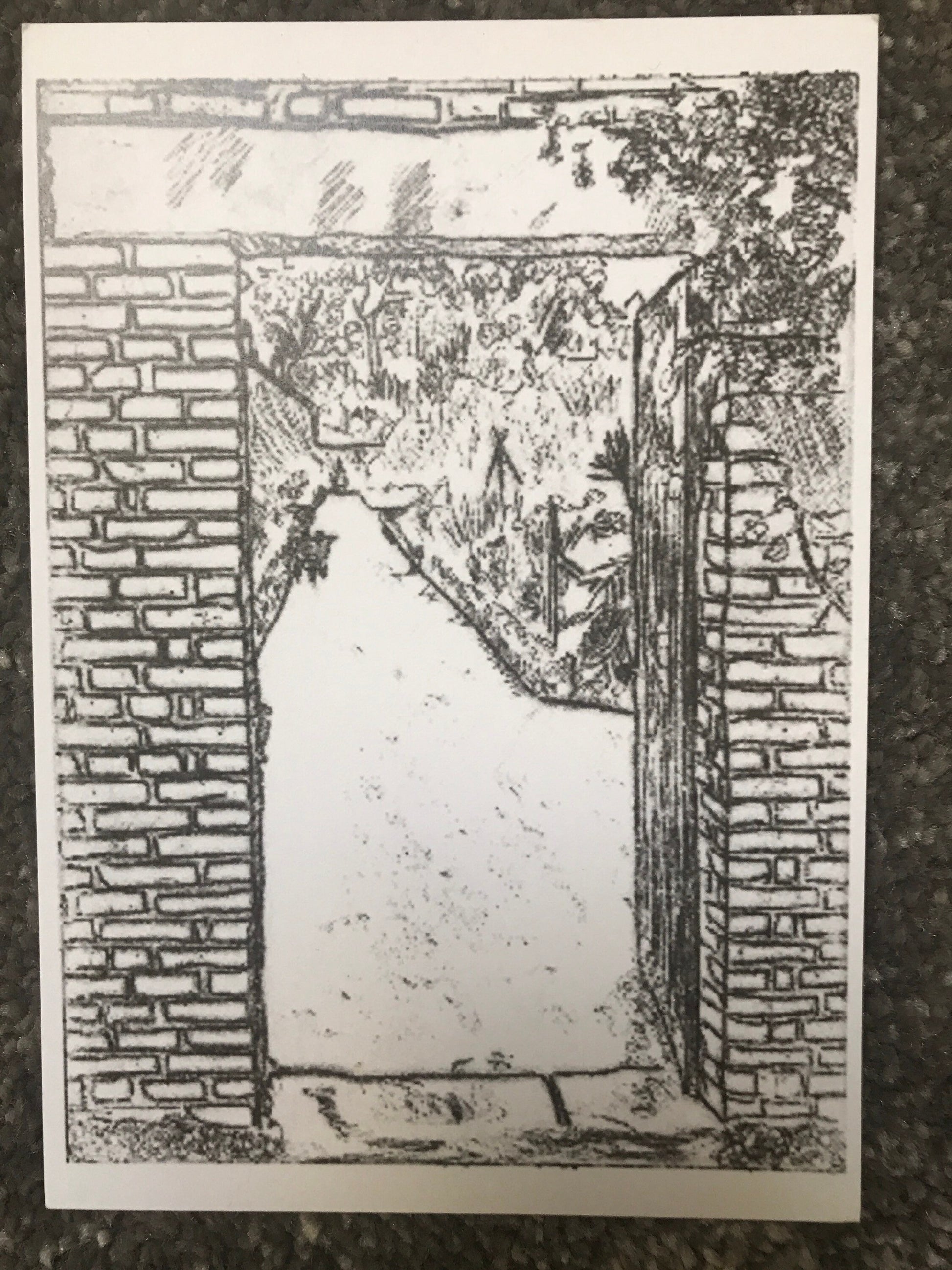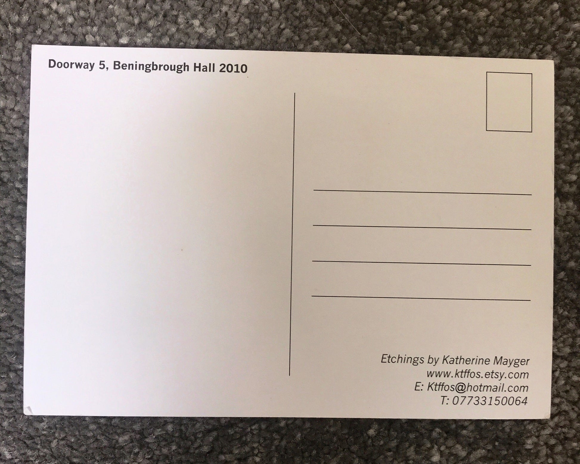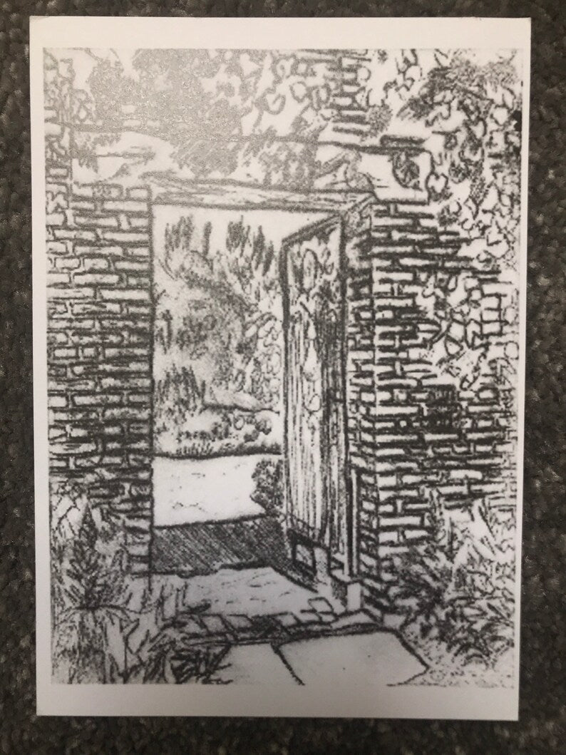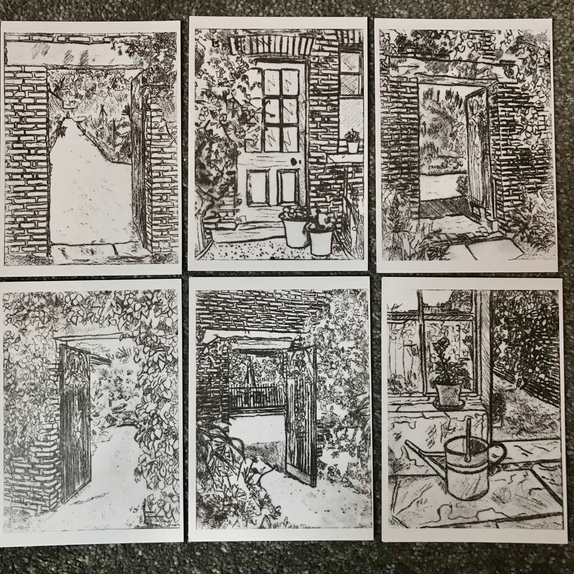 Pack of six printed postcards reproduced from original drypoint etchings of doorways in the gardens of Beningbrough Hall in Yorkshire.