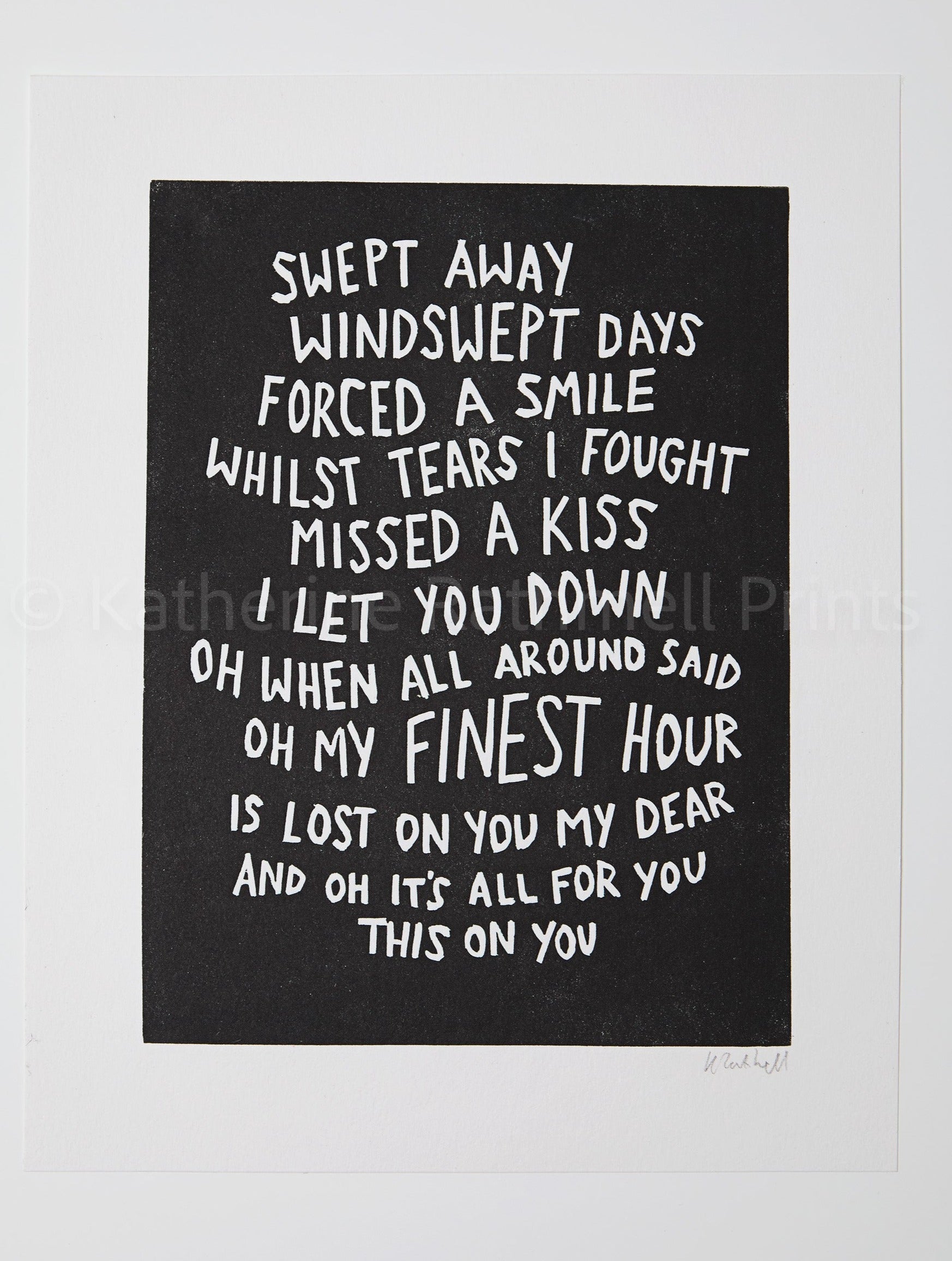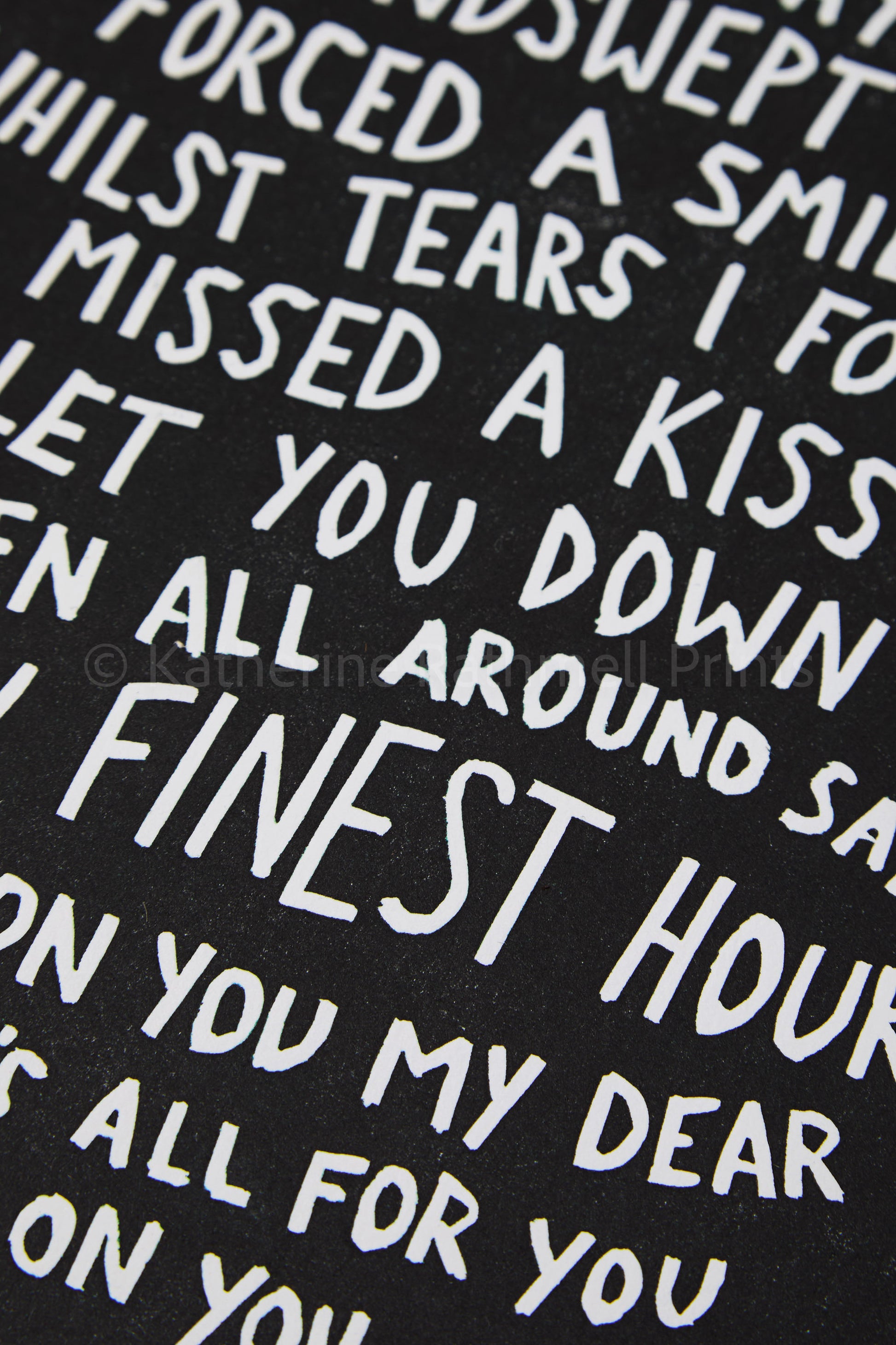 Featuring lyrics from Submotion Orchestra's 'Finest Hour', this linocut print measures 8x6" and comes in black or green.