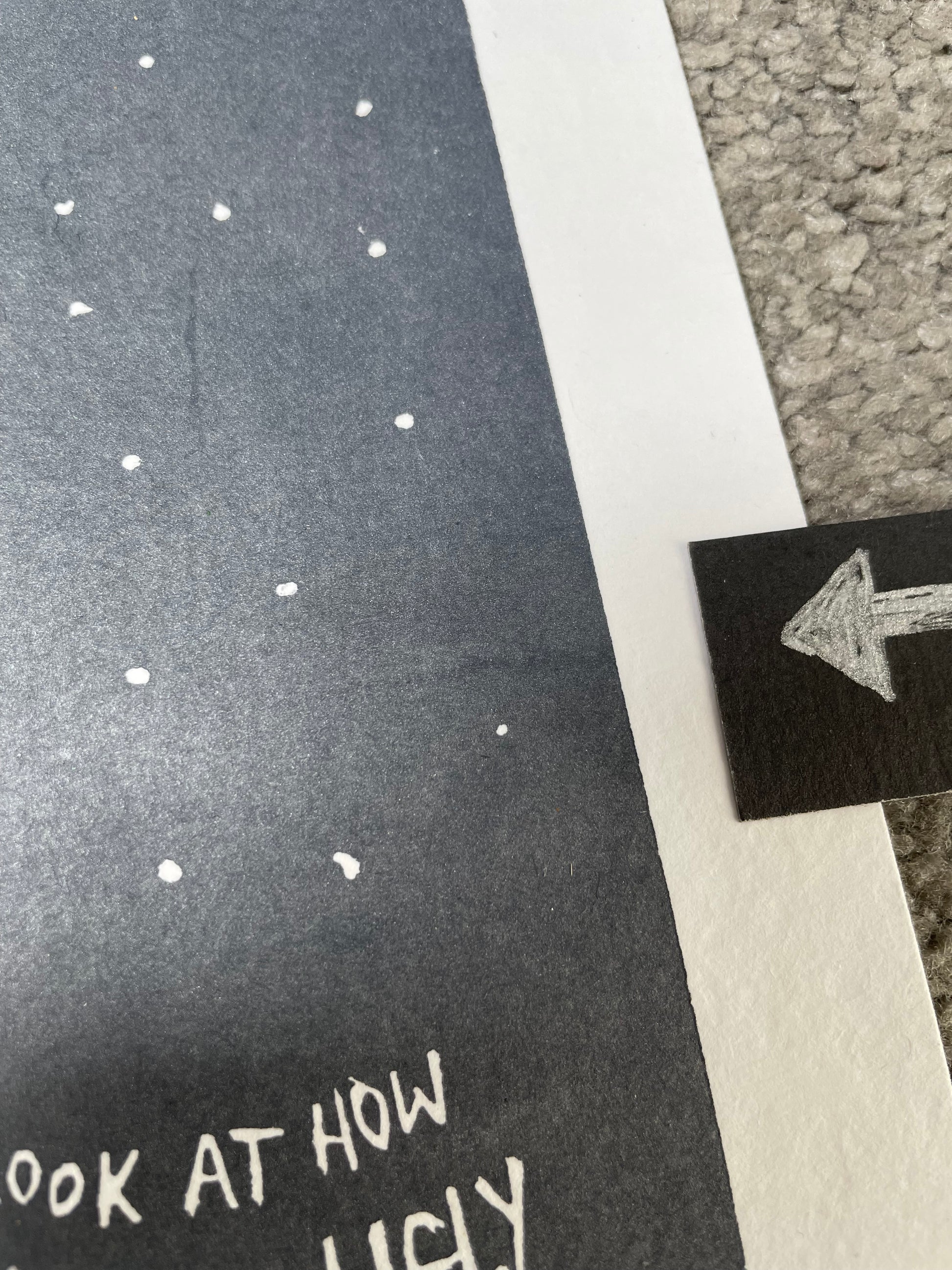 Original linocut print inspired by lyrics from band Alkaline Trios song 'Trouble Breathing". "Look at how goddamn ugly the stars are".