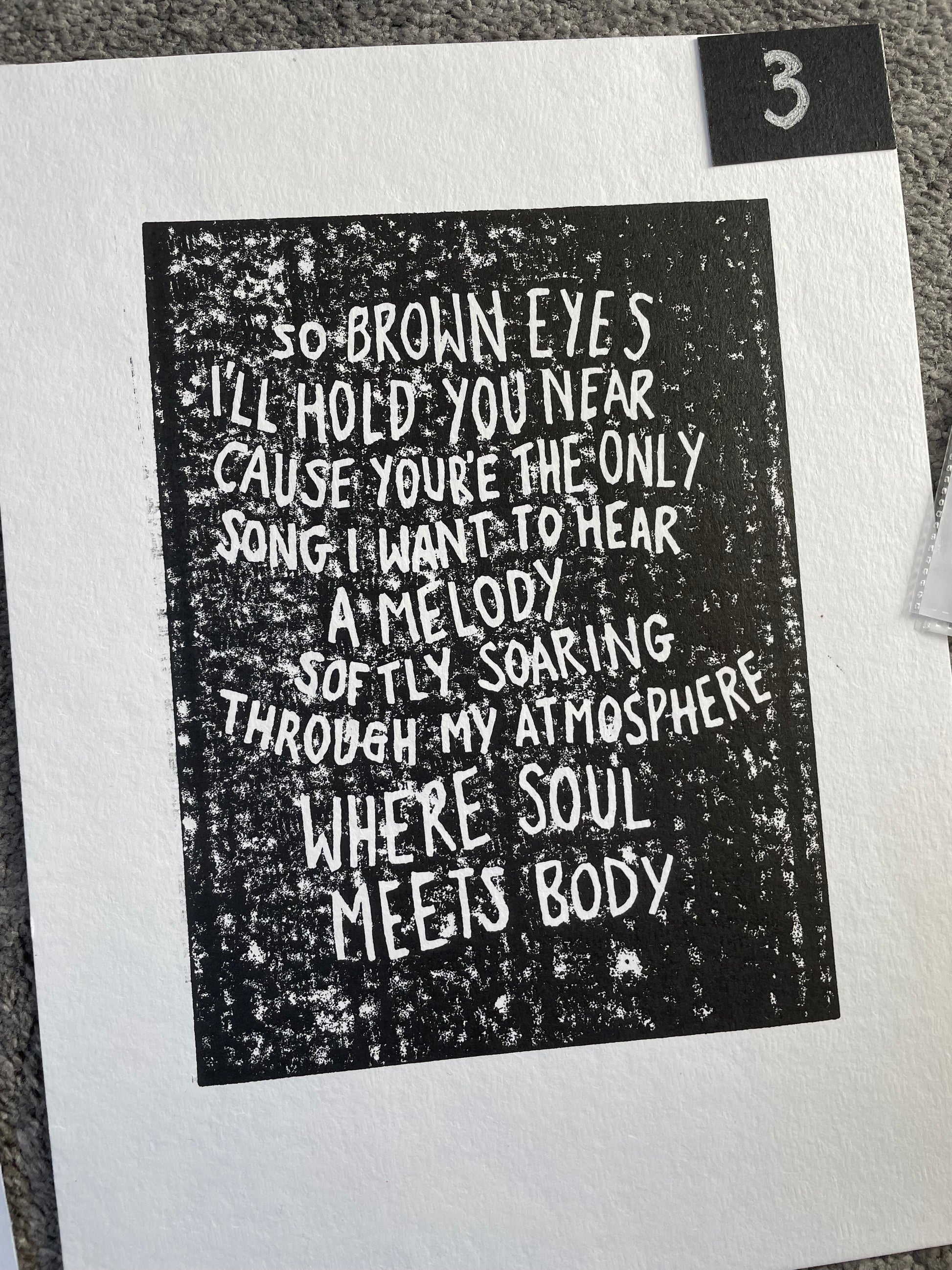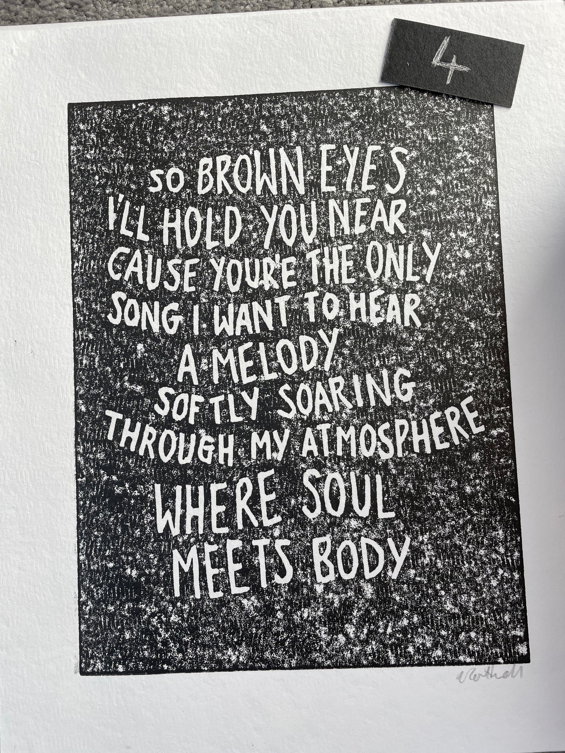 This is a linocut of lyrics from ‘Soul Meets Body’ by Death Cab For Cutie.
