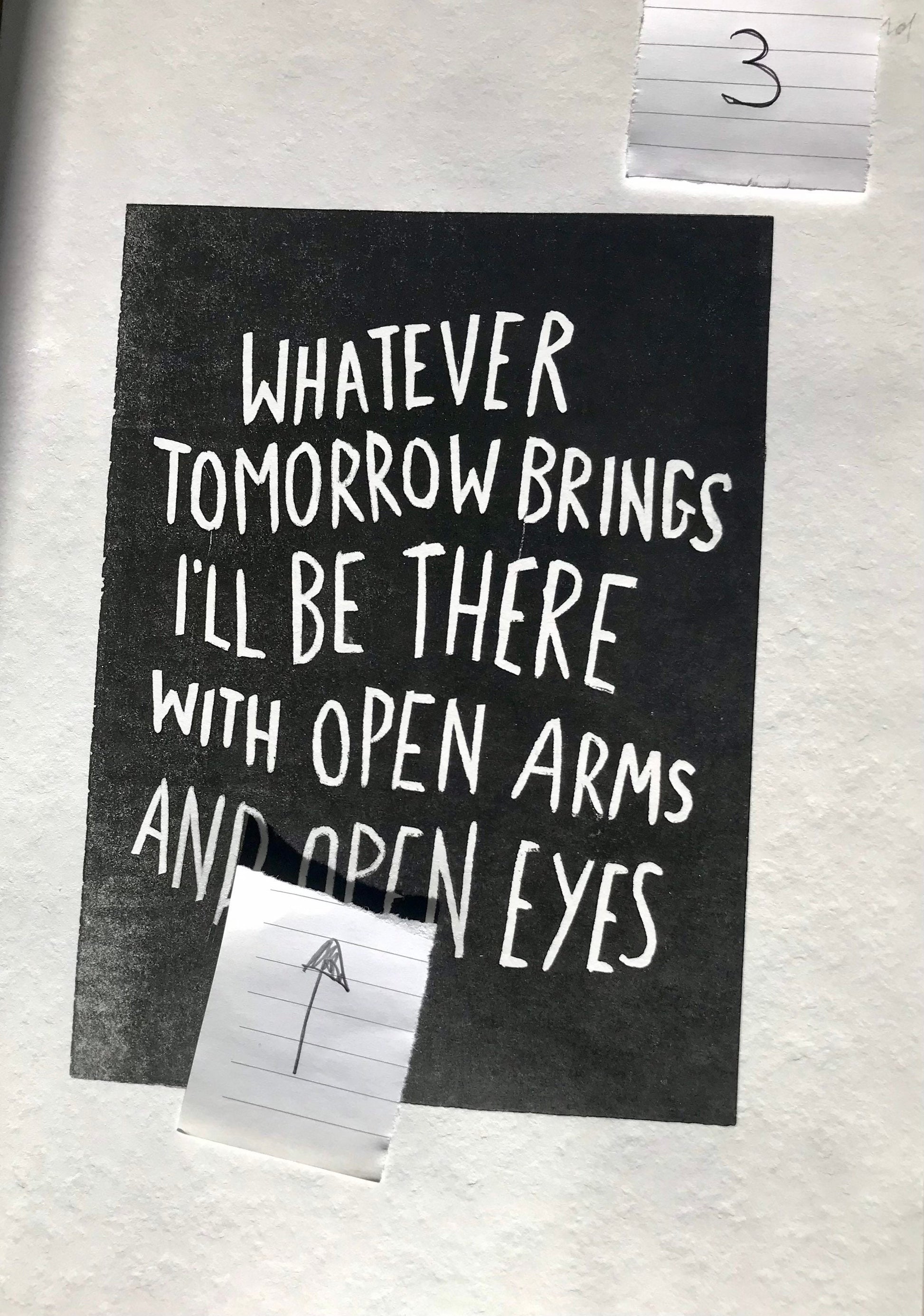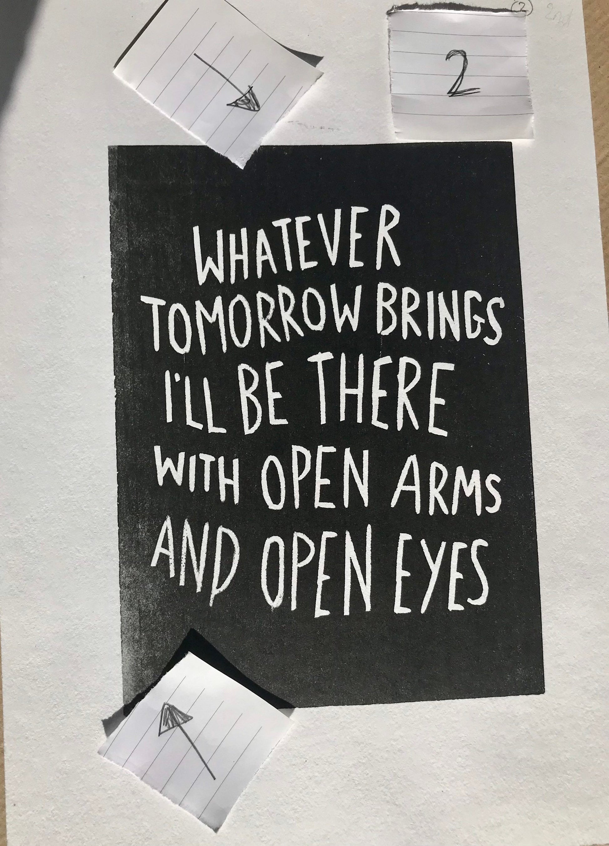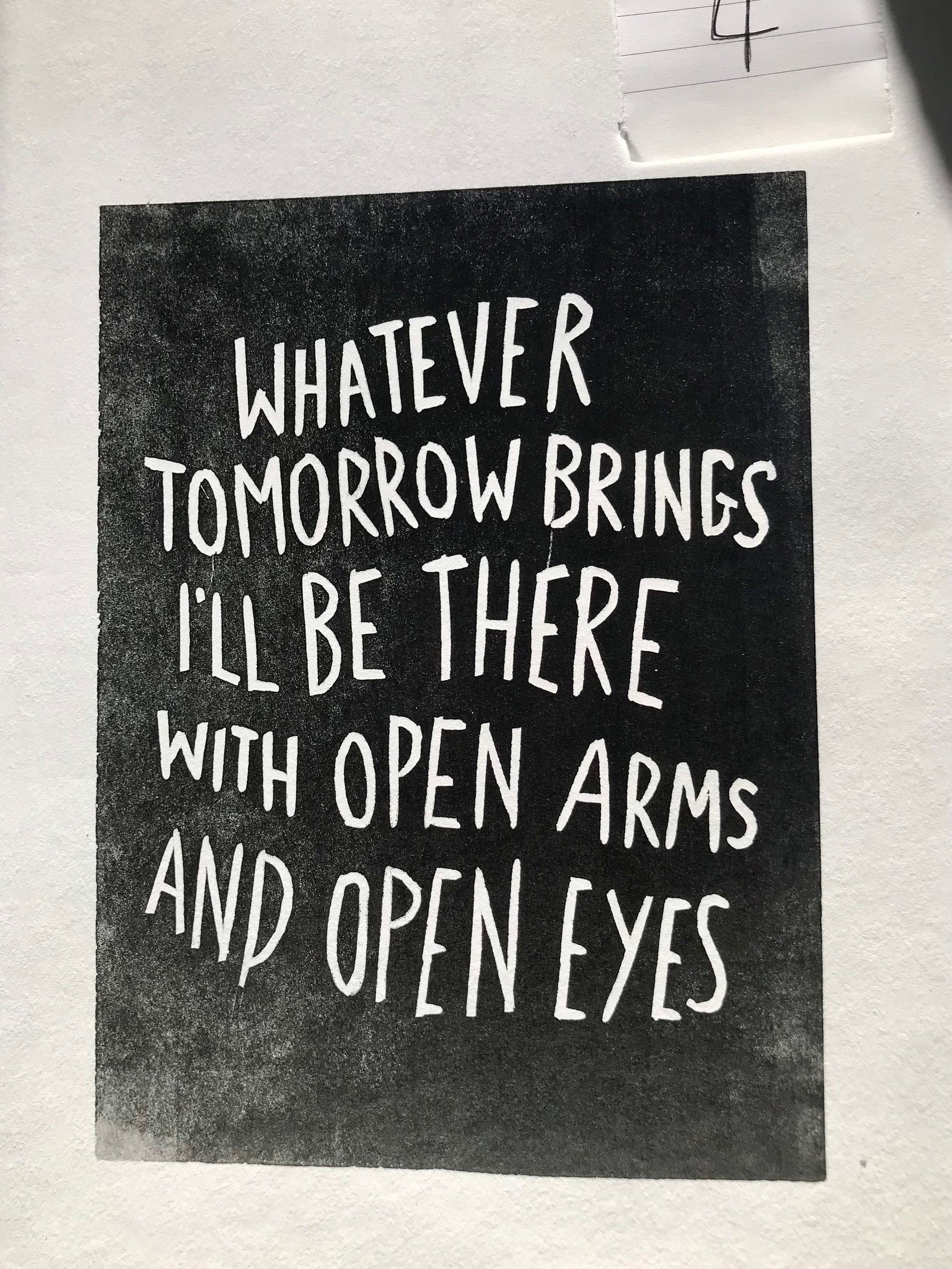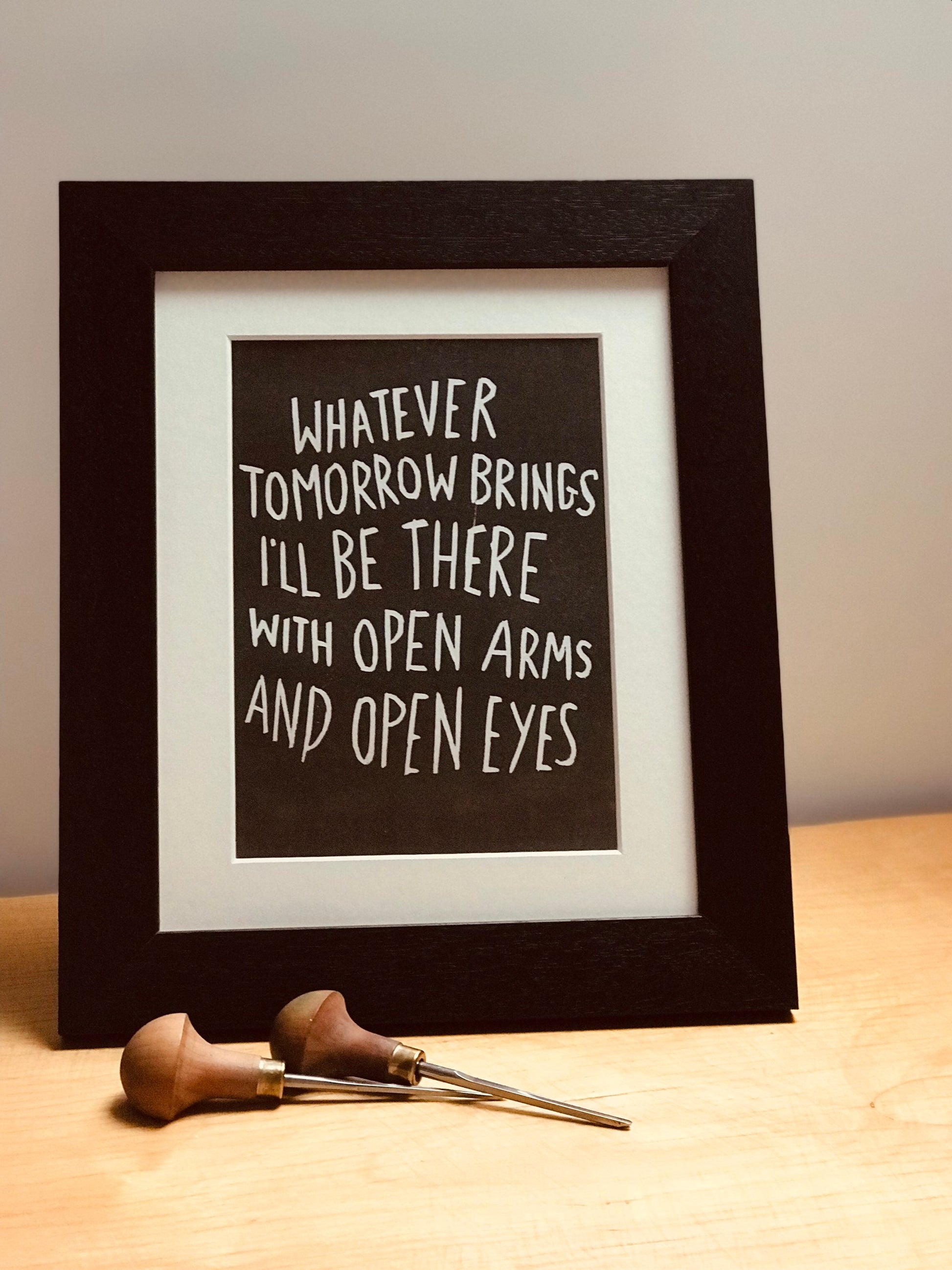 This linocut plate has been printed multiple times and is beginning to deteriorate, so all these prints have slightly uneven letters
