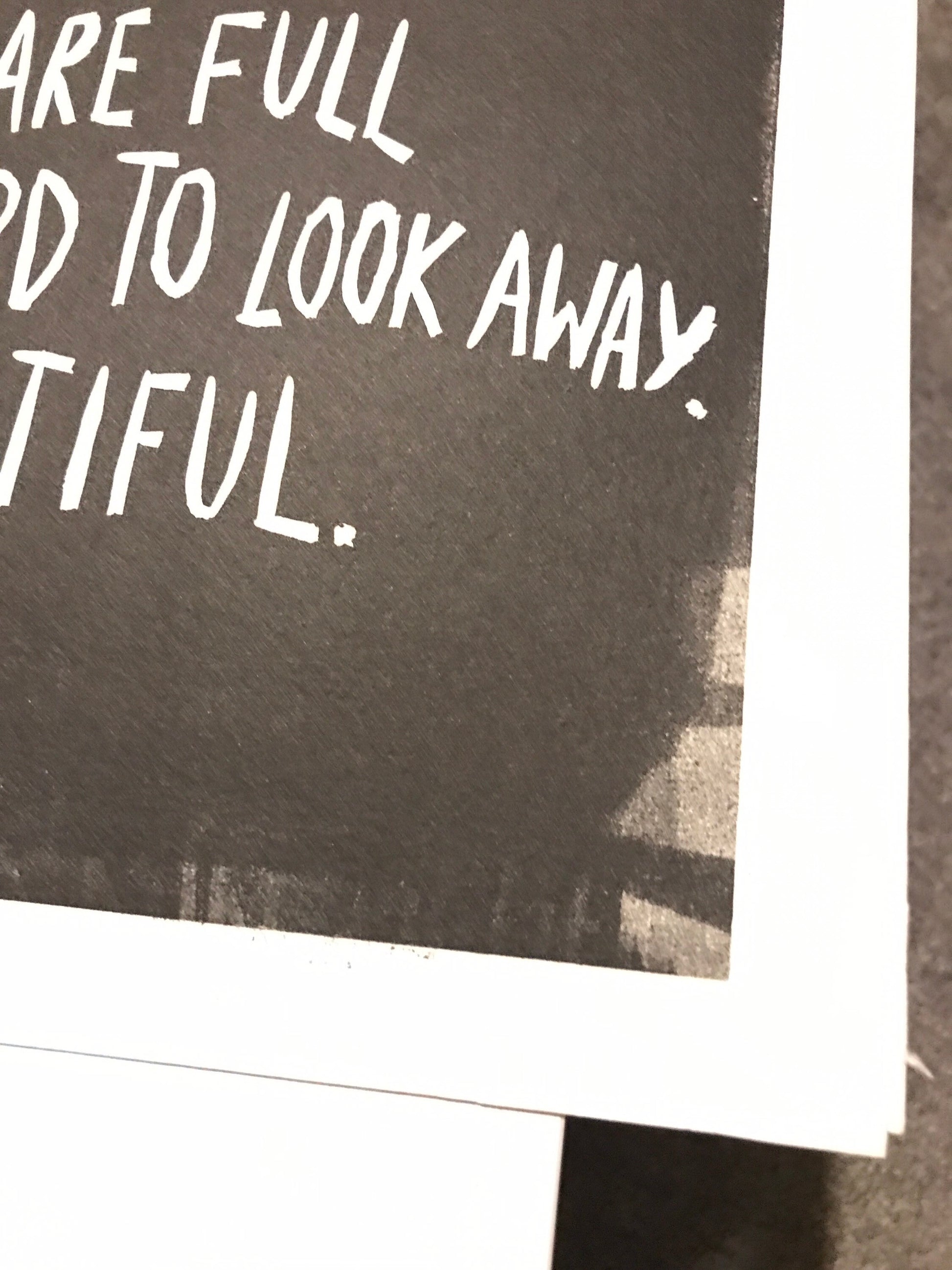 A linocut of the beautiful words of Alexandria Drzewiecki and a shimmering moon.