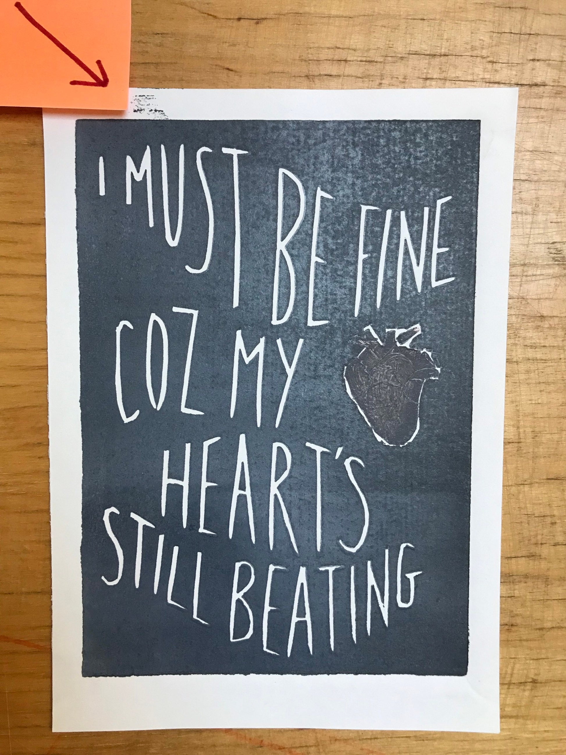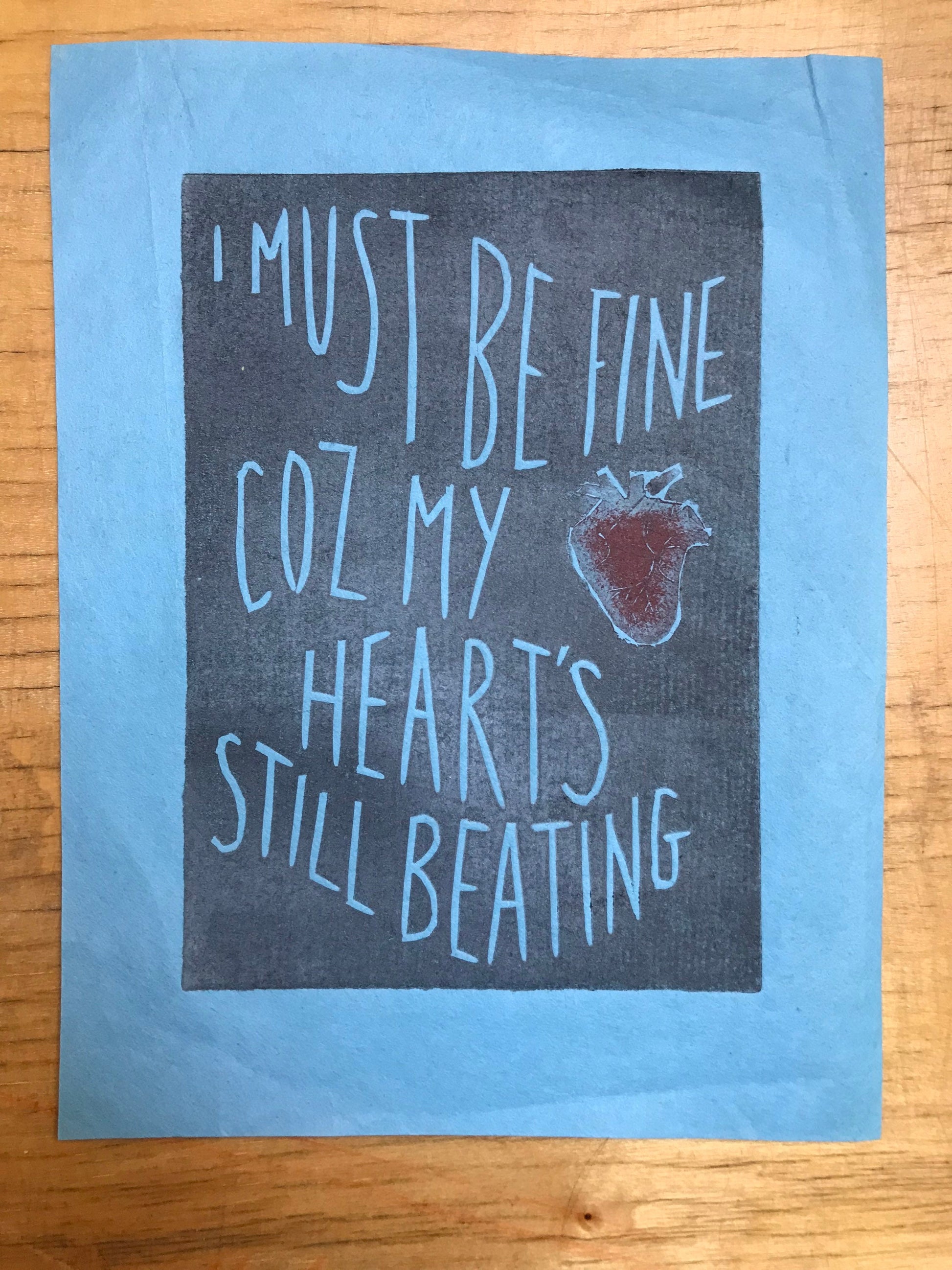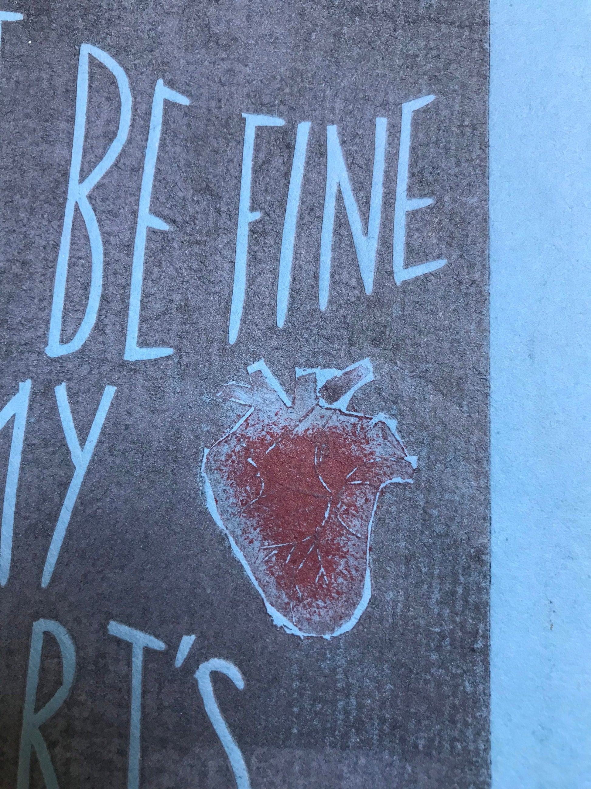 This is print created from two sections of Lino of lyrics from White Stripes ‘Fell in Love With A Girl’ “I must be fine coz my heart’s still beating”