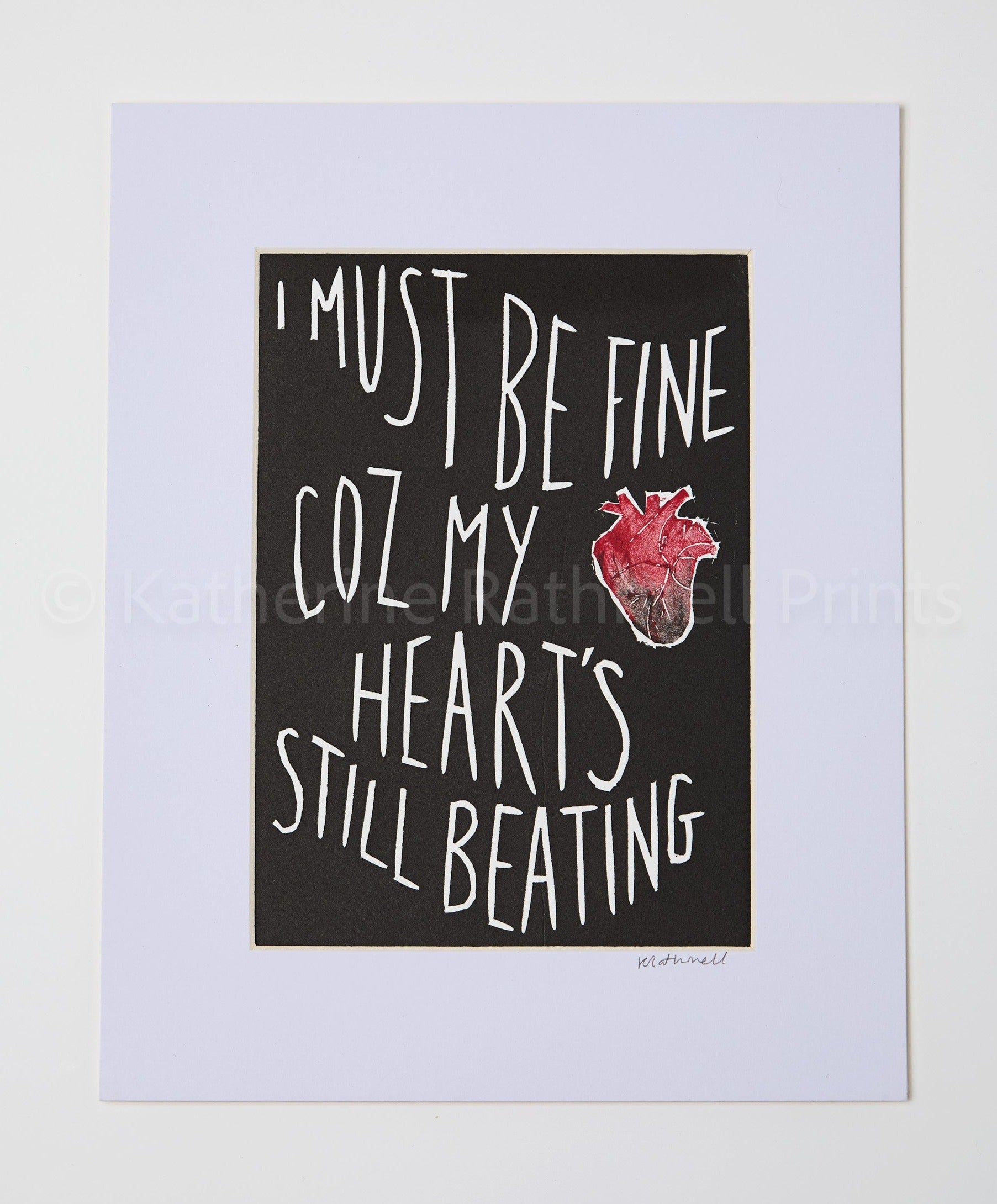 This print created from two sections of Lino is inspired by the lyrics from White Stripes ‘Fell in Love With A Girl’ - “I must be fine coz my heart’s still beating”